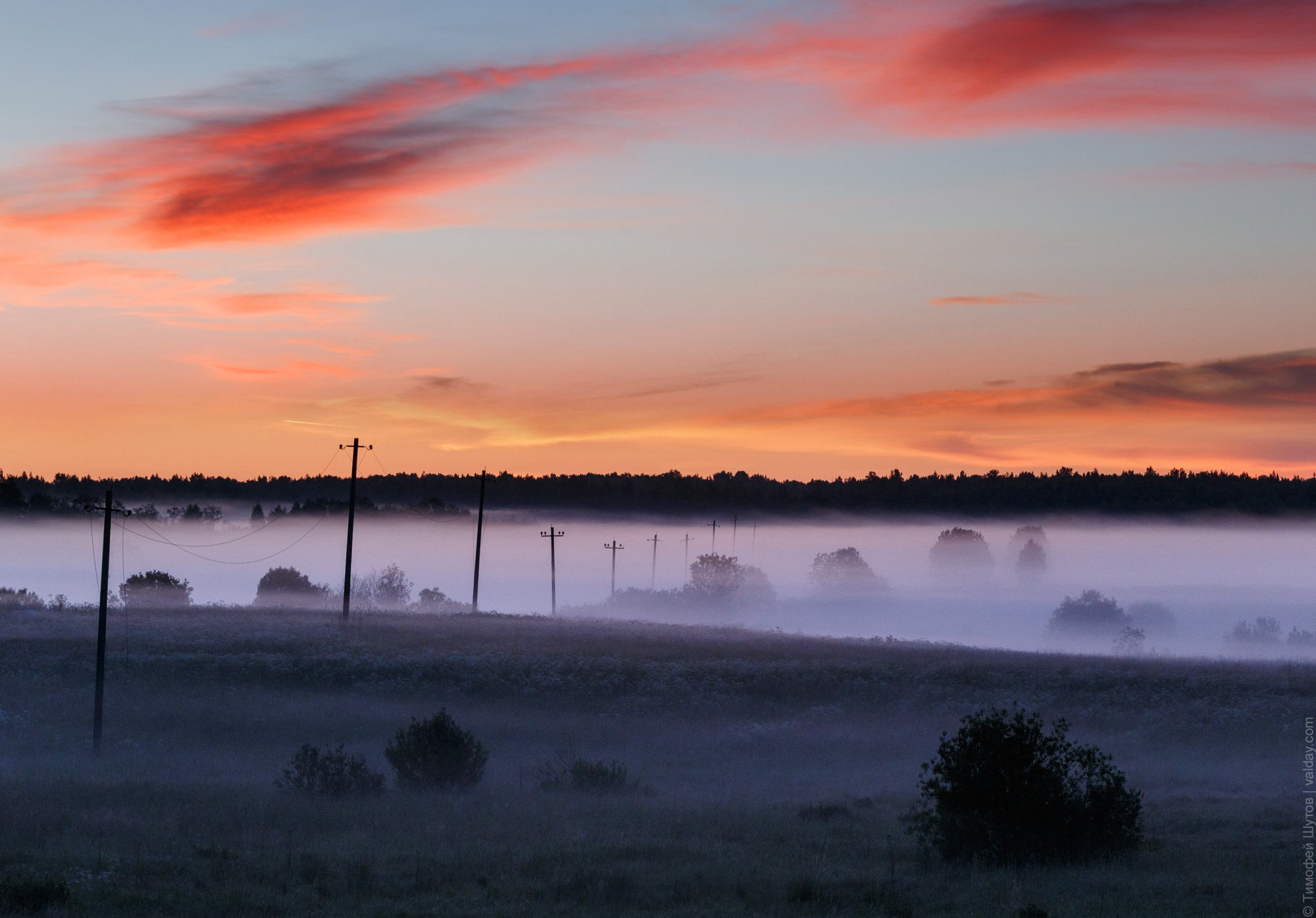 Однажды мы ехали с большого ночного концерта группы ДДТ (валдайцы поймут, что это было в 2018 в Окуловке), на часах 4 утра, светает, пустынная дорога. В заполненной впечатлениями голове эхом ворочается усталость от трех часов громкого рока и фотосъемки в фотопите у самой сцены. Глаза предательски слипаются, доехать бы до дома. Но когда я увидел это… Супруга укоризненно покачала головой, но поделать ничего не могла, я остановил машину и ушёл в росу снимать эту картину