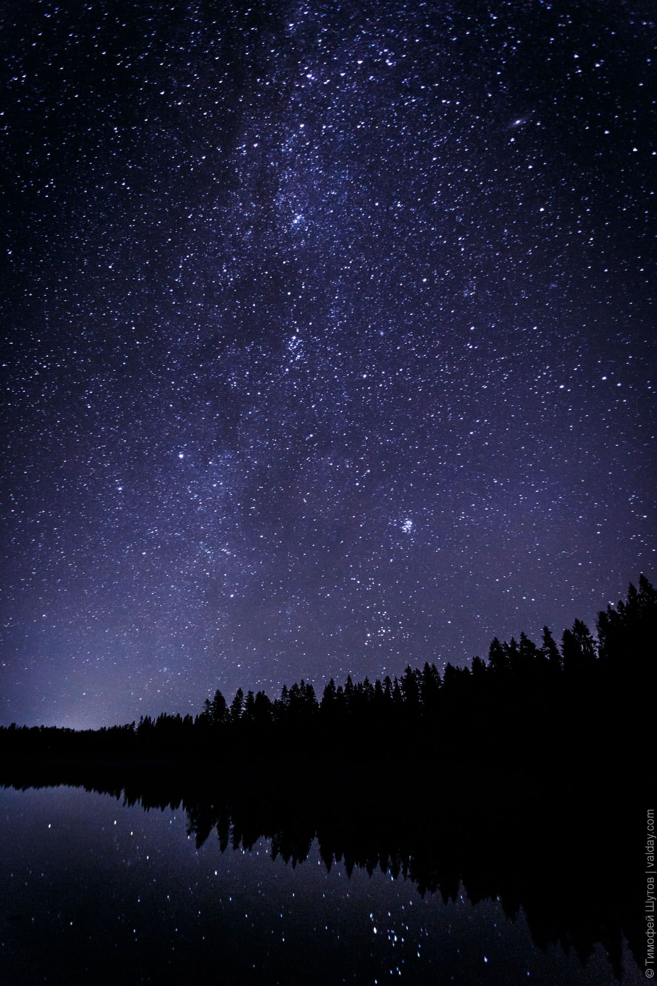 На болоте вокруг озера уже ощутимый минус, мох заблестел и заискрился. Вызвездило сегодня на отличненько, на воде полный штиль и полное ощущение, что космос у тебя под ногами.