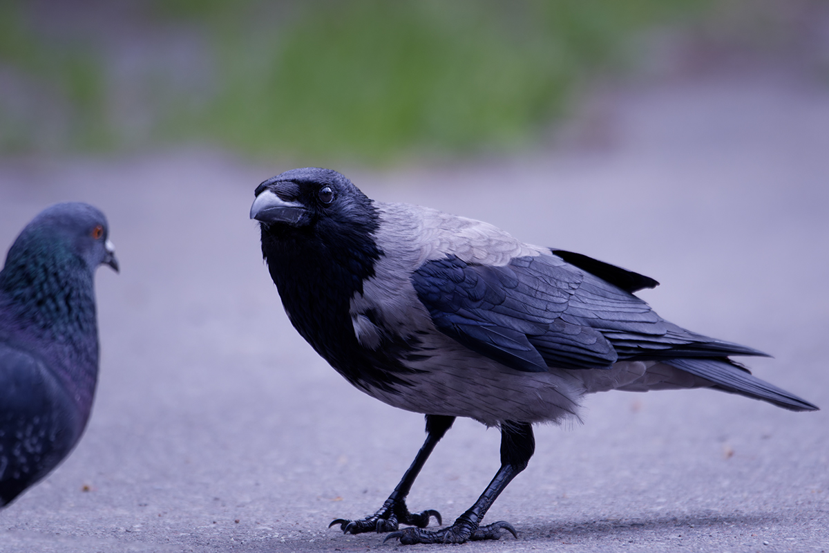 Серая ворона явно хотела побеседовать с голубем. Но что-то разговор у них не заладился, сизый быстренько ушел.