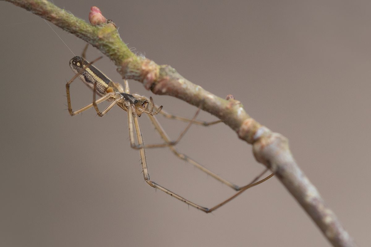 Стройное существо, с длинным телом и лапками. Прекрасно маскируется, вытягивается по длине стебля растения. Я много раз думала просто веточка или стебель, а потом бац - шевелится.