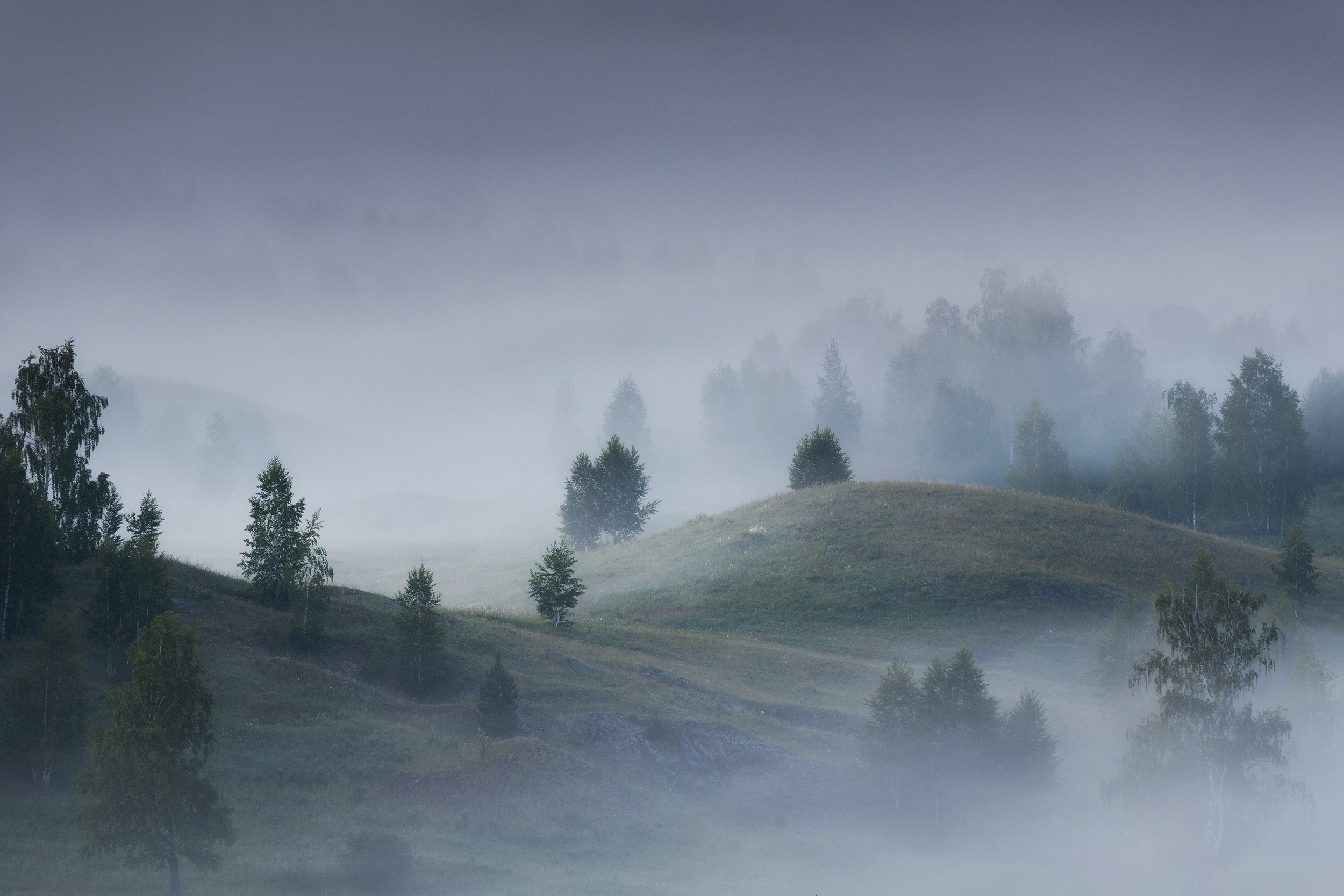 Туман медленно стелется по склонам, окутывая деревья и поляны в мягкий, почти прозрачный покров. На фоне серого неба вырисовываются силуэты сосен, а дальние холмы теряются в дымке. Сцена передаёт ощущение покоя и первозданной природы, будто время остановилось. Фотография Татьяны Бирюковой захватывает мгновение, когда мир ещё не проснулся, но уже наполнен светом.