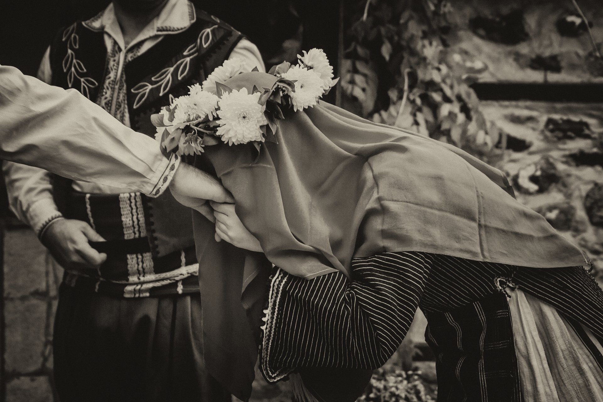 A snapshot of a traditional Bulgarian wedding reenactment - here the bride has to part with her parents and head for her new home.