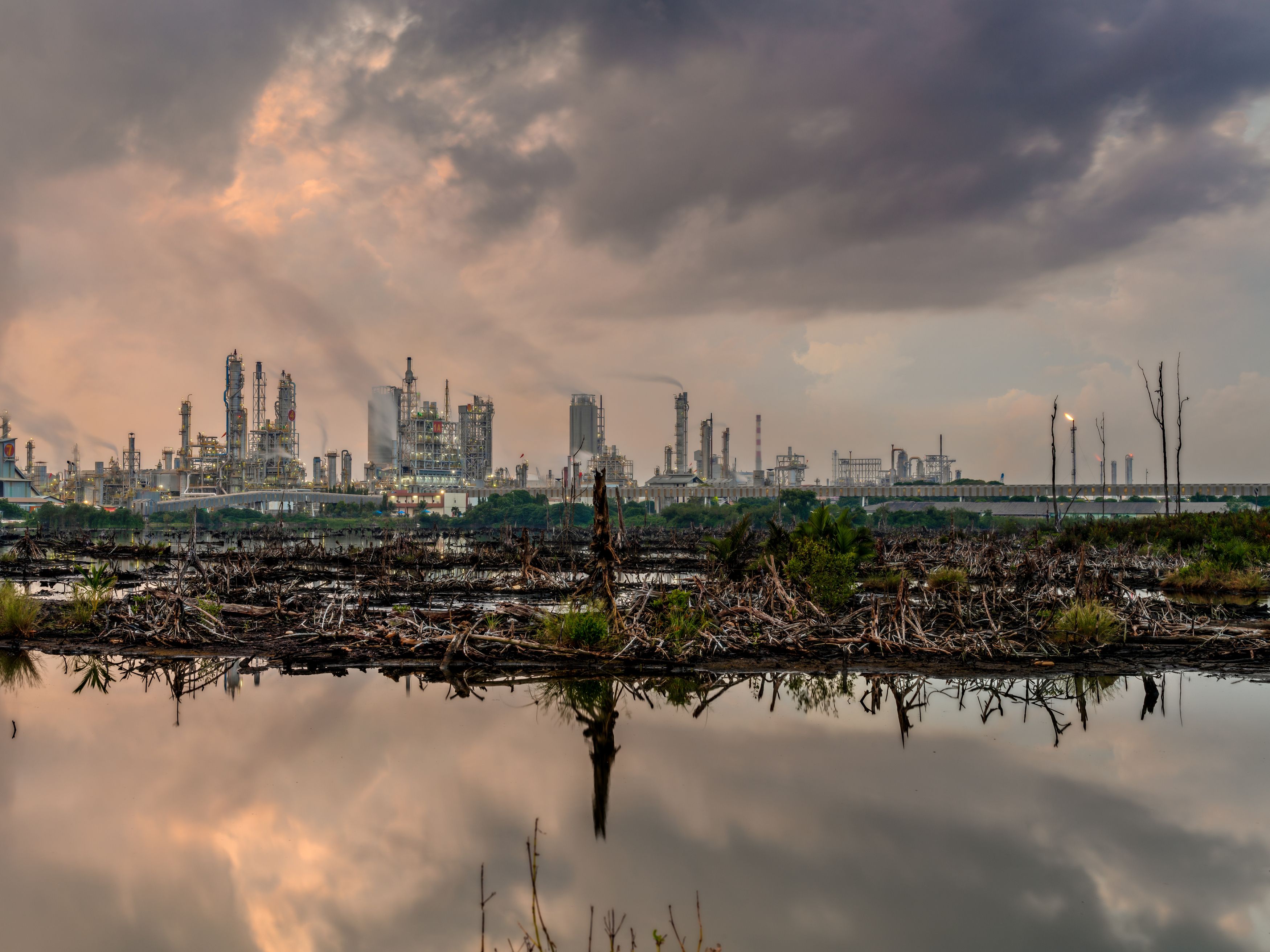 Early morning at fertilizer plant. Dying mangrove, exhaust steam from factory, cloud reflected perfectly on water. This is habitat of crocodiles, anhinga melanogaster, king fisher and several water birds.