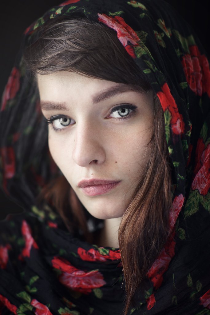 girl,portrait,green eyes,scarf,flowers, Боби Костадинов