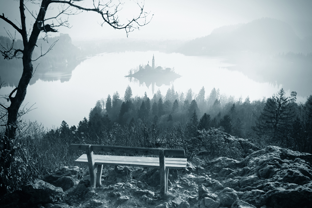 Свет мягкий, композиция выверена: скамья как якорь, остров-призрак в дымке, ветка слева добавляет глубину.