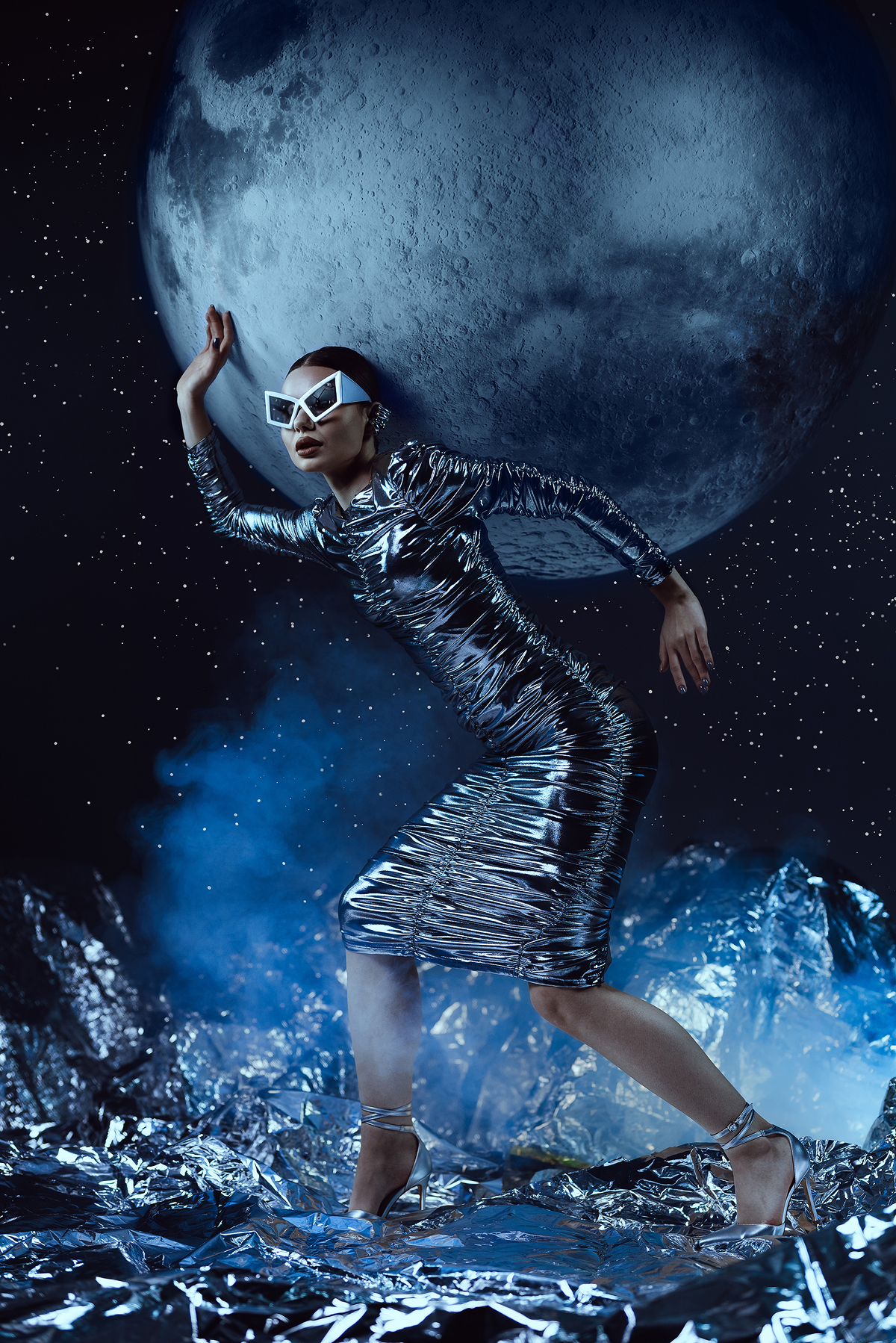 Сильная визуальная концепция — космический образ, игра света на металлической ткани, глубина кадра с Луной и кристаллическим ландшафтом. Холодная цветовая гамма усиливает атмосферу. 👁️✨