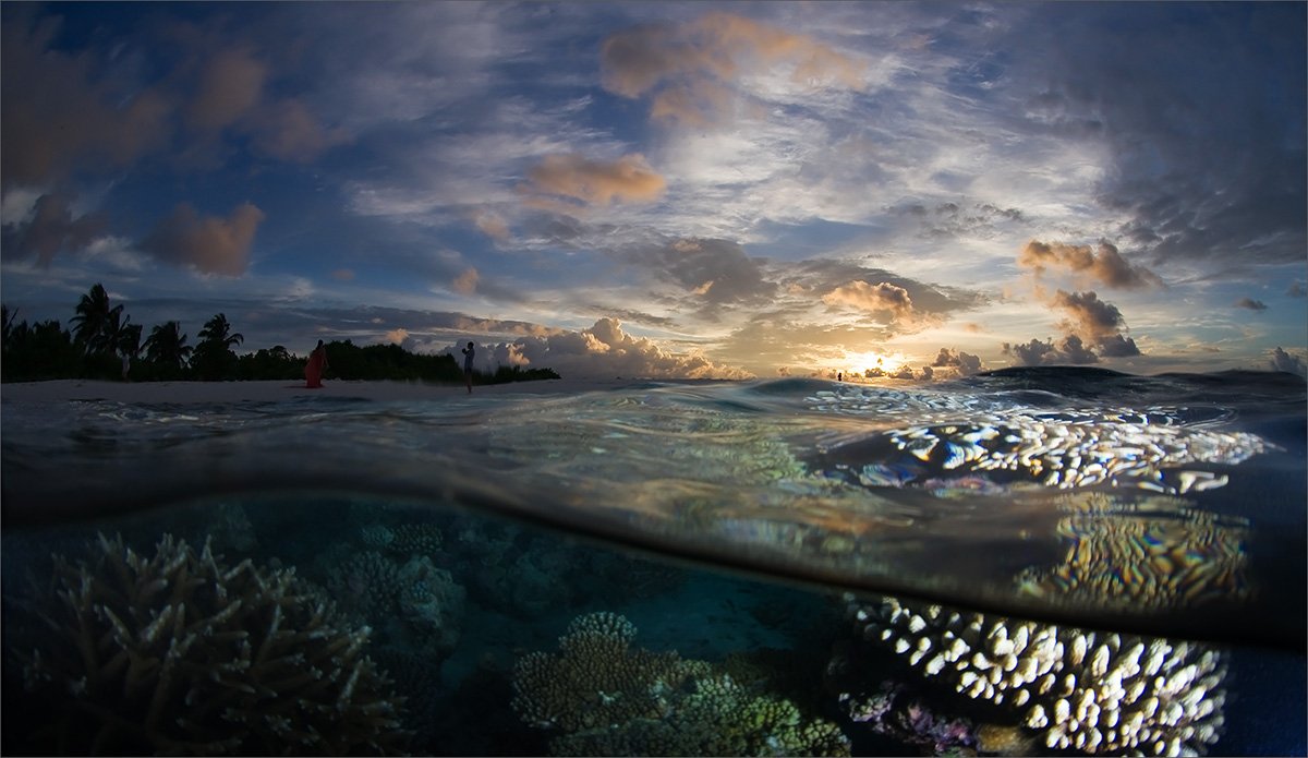 я ещё не была на Мальдивах, я ещё не фотографировала под водой. Поэтому данная картинка кажется мне нереальной и сказочной. Если покопаться в подсознании, абстрагировавшись от красоты, я бы поставила 5+ за технику фотографирования водорослей под водой с совмещением пейзажа и тем более восхищает виденье водорослей над водой, по поверхности. Что поверхность воды не просто поверхность, она ещё отражает и всю подводную красоту :) в Общем- у меня нет слов, так- путаница. Подобное вижу впервые и всё увиденное для меня и ново и знакомо...