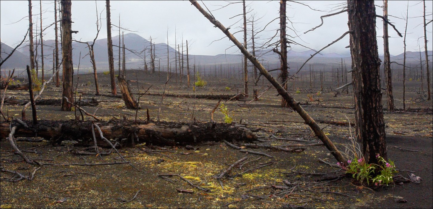Слой вулканического пепла, укрывающего этот участок – от 2 до 8 метров. Взгляду открыты только верхушки лиственниц, которые во время извержения в районе вулкана Плоский Толбачик были не сожжены лавовыми потоками, а обожжены и задушены растущим слоем горячего пепла.
