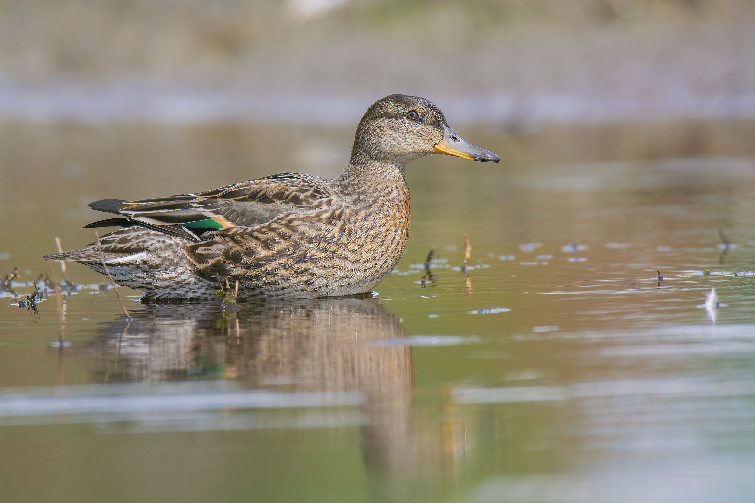 Это самка чирка-свистунка :)... когда сидел в засидке, подплыли маленькие уточки. А глаз у них намётан на что-то странное, поэтому они останавливались и пристально всматривались в мою сторону :))) потом спешили побыстрее убежать :) ... Совсем малявки :) размером с голубя и имеет яркую зелёную полоску на крыле :)