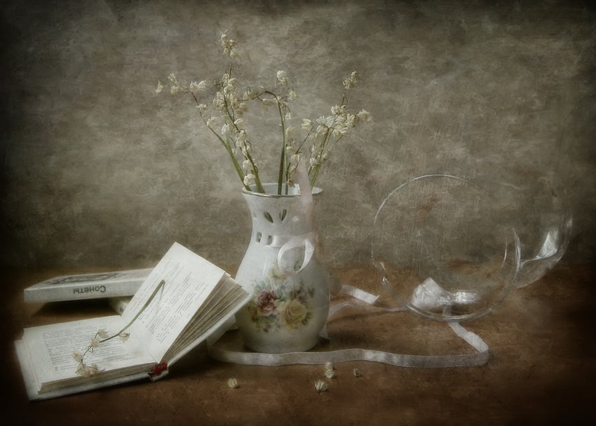 Ваза, Гербарий, Книги, Ландыши, Лента, Сонеты, button