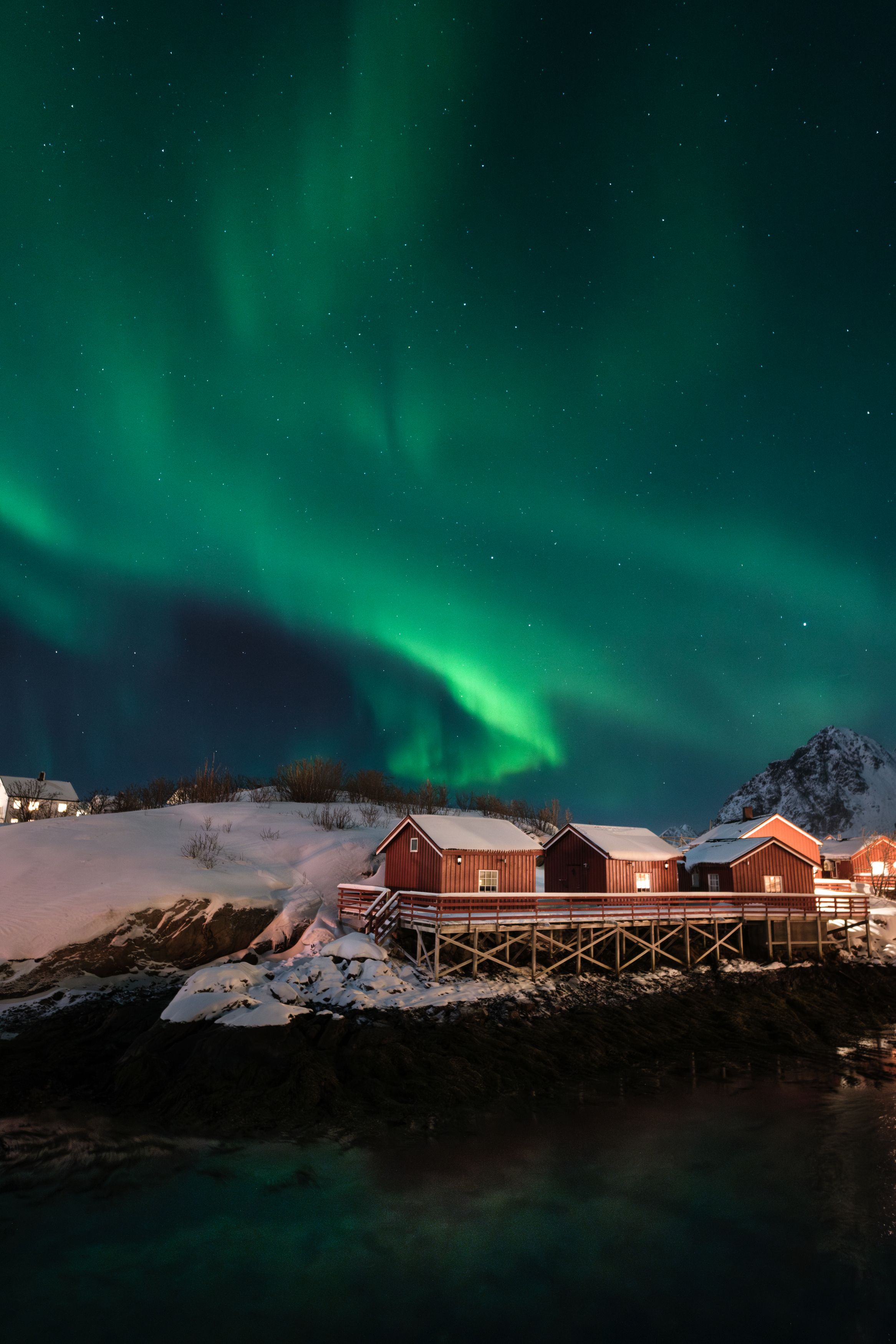 Вы запечатлели северное сияние над деревней с точностью и выдержкой — зелёные полосы в ночном небе контрастируют с красными домами на снегу, а отражение в воде добавляет глубины. Хорошо удержан баланс света и тени.