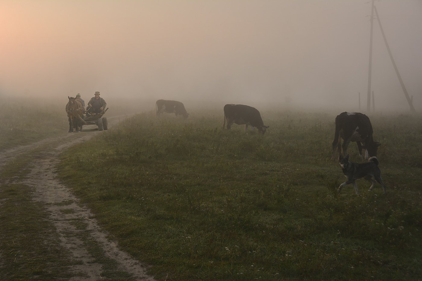 коровы собака телега туман рассвет, Дмитрий Колисниченко