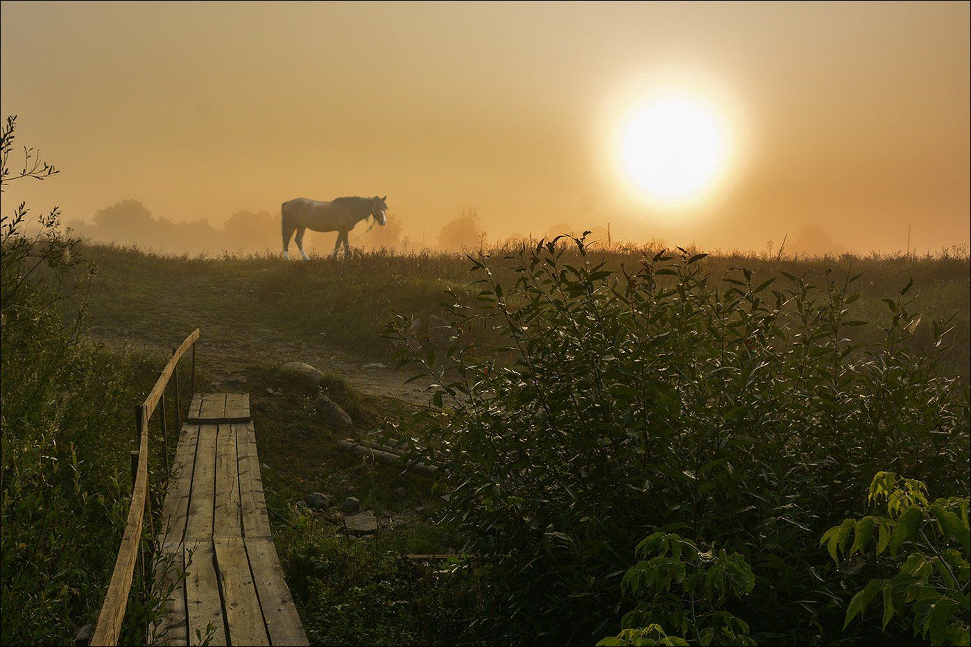 деревня, утро, туман, конь, солнце, роса, мостик, Дмитрий Колисниченко