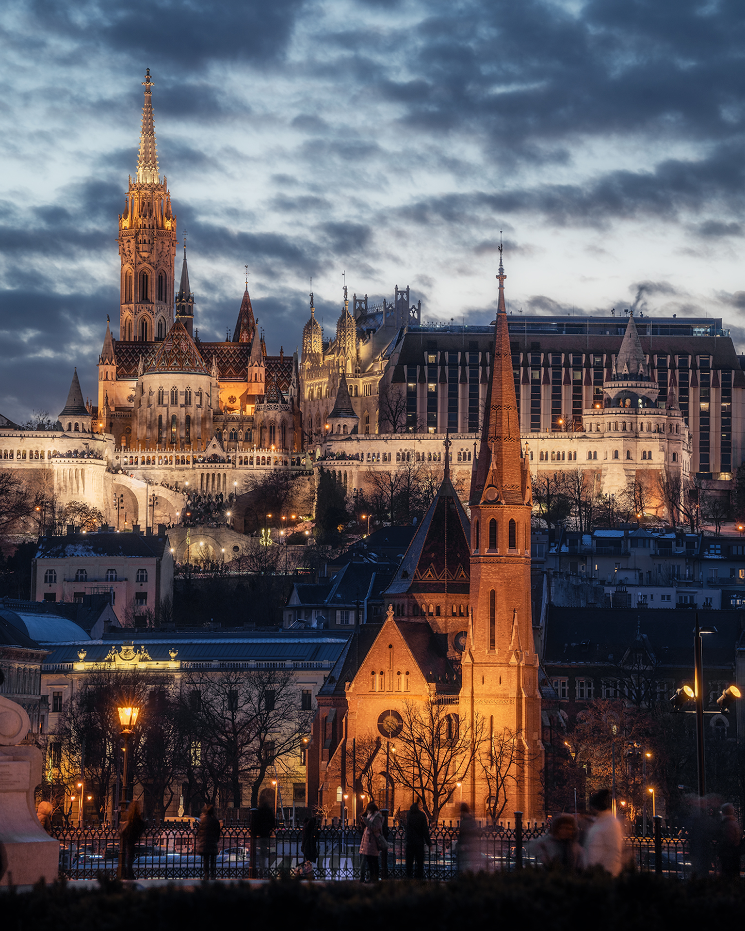 Вечерний город раскрывается в мягком свете уличных фонарей и окон, подчёркивающем контуры готических шпилей и старинных фасадов. На переднем плане — уютная церковь, а на заднем — возвышающиеся купола и башни. Небо, покрытое тёмными облаками, добавляет сцене глубины и настроения. Фотография передаёт гармонию архитектуры и природы в момент перехода от дня к ночи.