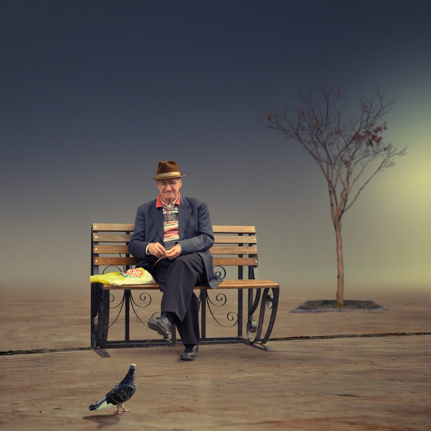 dove, bench, man, old, food, tree, grass, nature, Caras Ionut