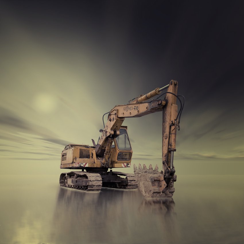 truck, excavator, water, ocean, reflection, sky, clouds, long exposure, Caras Ionut