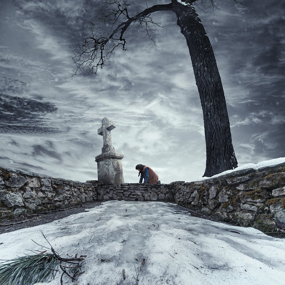 old, woman, stone, cross, tutorials, manipulation, psd, photoshop, sky, clouds, winter, snow, cold, tree, Caras Ionut