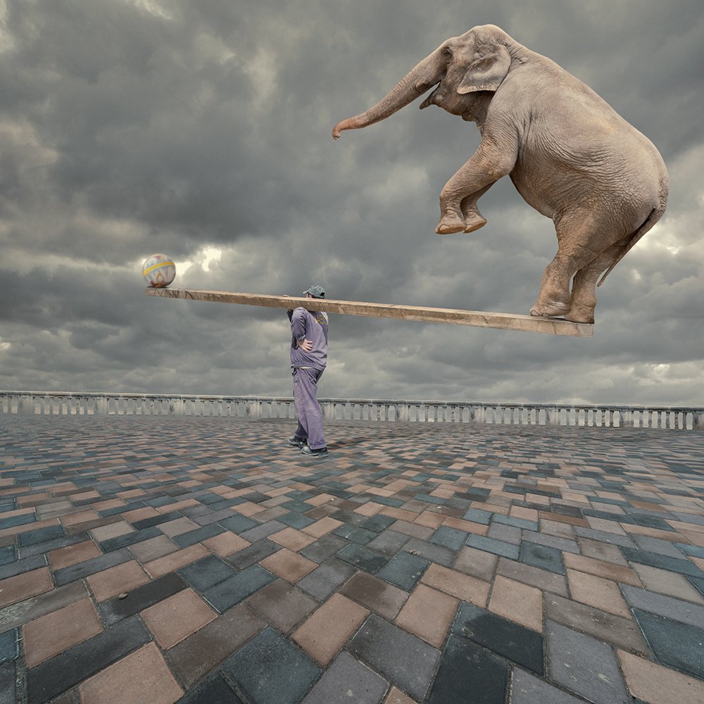 elephant, man, wood, balance, tutorials, psd, manipulation, photoshop, sky, clouds, stone, brick, square, ball, acrobatic, adrenaline, Caras Ionut