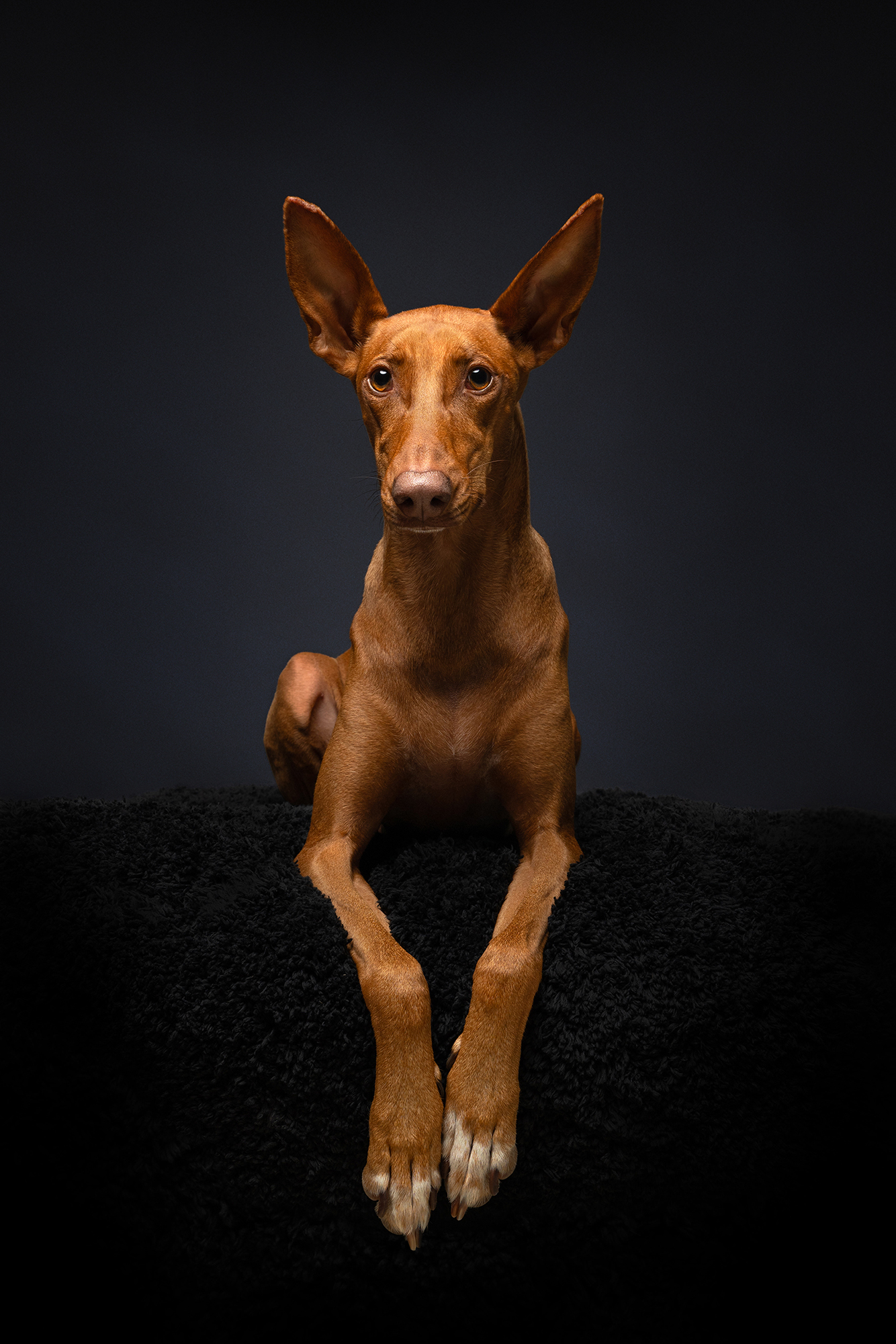 Ruby looks right into the camera with quiet confidence—her lean frame and alert ears stand out against the dark, soft background. A clean, focused portrait that lets the dog’s presence speak for itself.