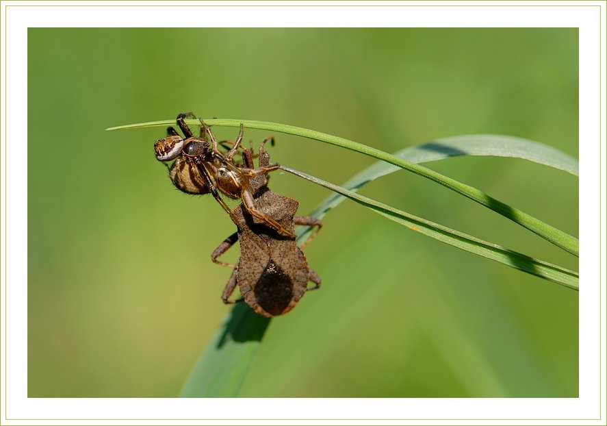 Пока похоже на то, что во время спаривания паучихза решила полакомиться клопом или во время того же спаривания, клоп напал на паучиху ... это и непонятно ...