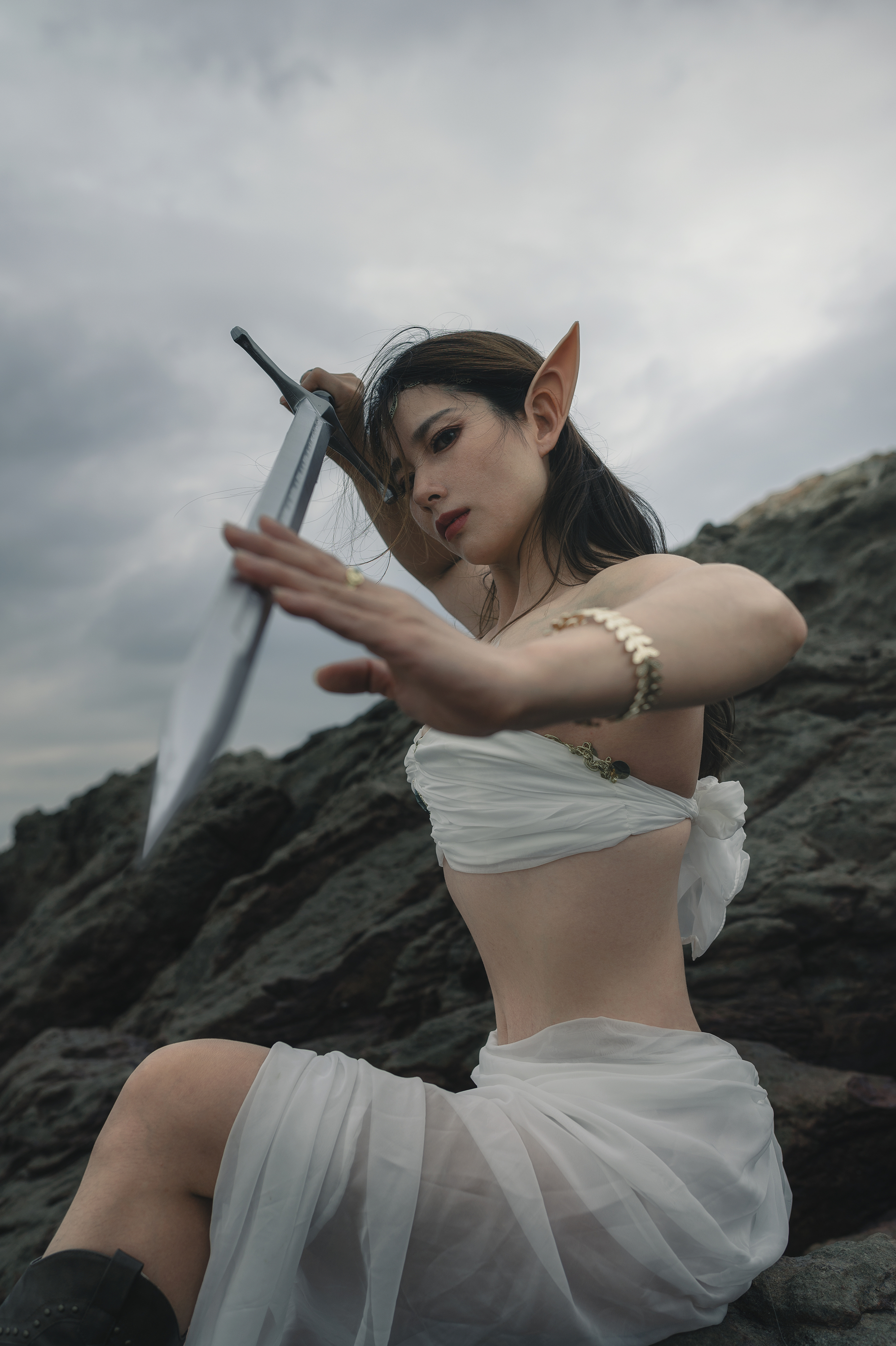 A strong pose, natural light, and a clear focus on the subject. The contrast between the soft white fabric and the rough rocks works well. The elf ears and sword add fantasy without overpowering the shot. Solid composition. 🌧️⚔️