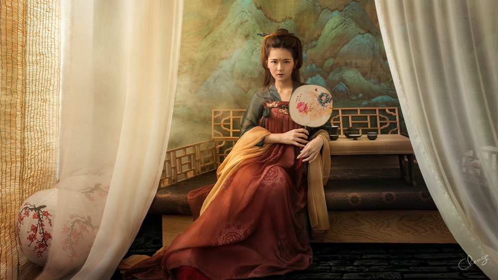 Soft light, gentle folds of fabric, quiet elegance. The setting feels lived-in, not staged. The fan and the painted backdrop add just enough detail without overpowering. A calm, thoughtful presence.