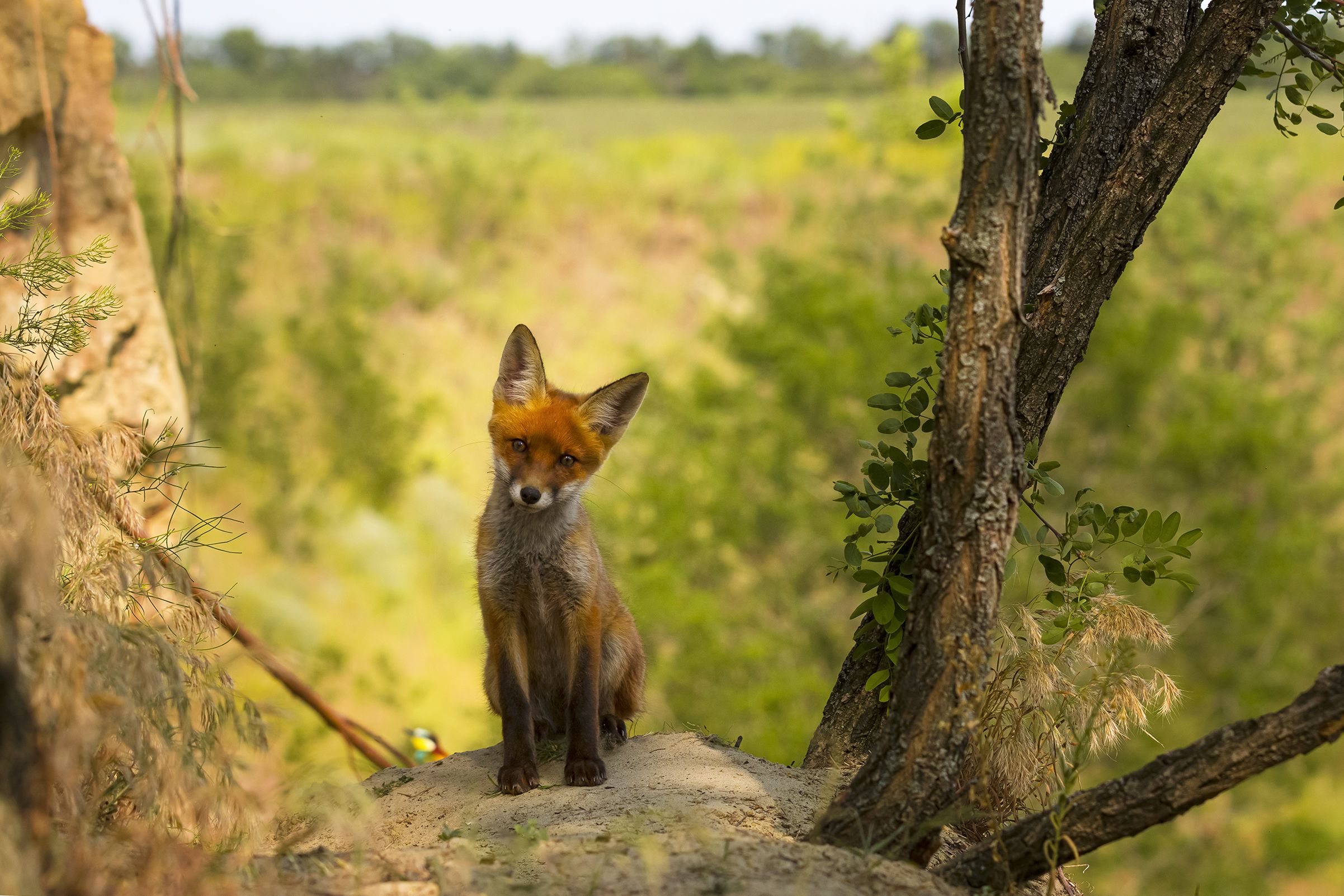 Нора расположена в границе заброшенного песчаного карьера,произошёл обвал грунта и выход с норы был слишком близко к обрыву,но лисёнок удержался и не упал,из трёх стволов акации остался один на краю
