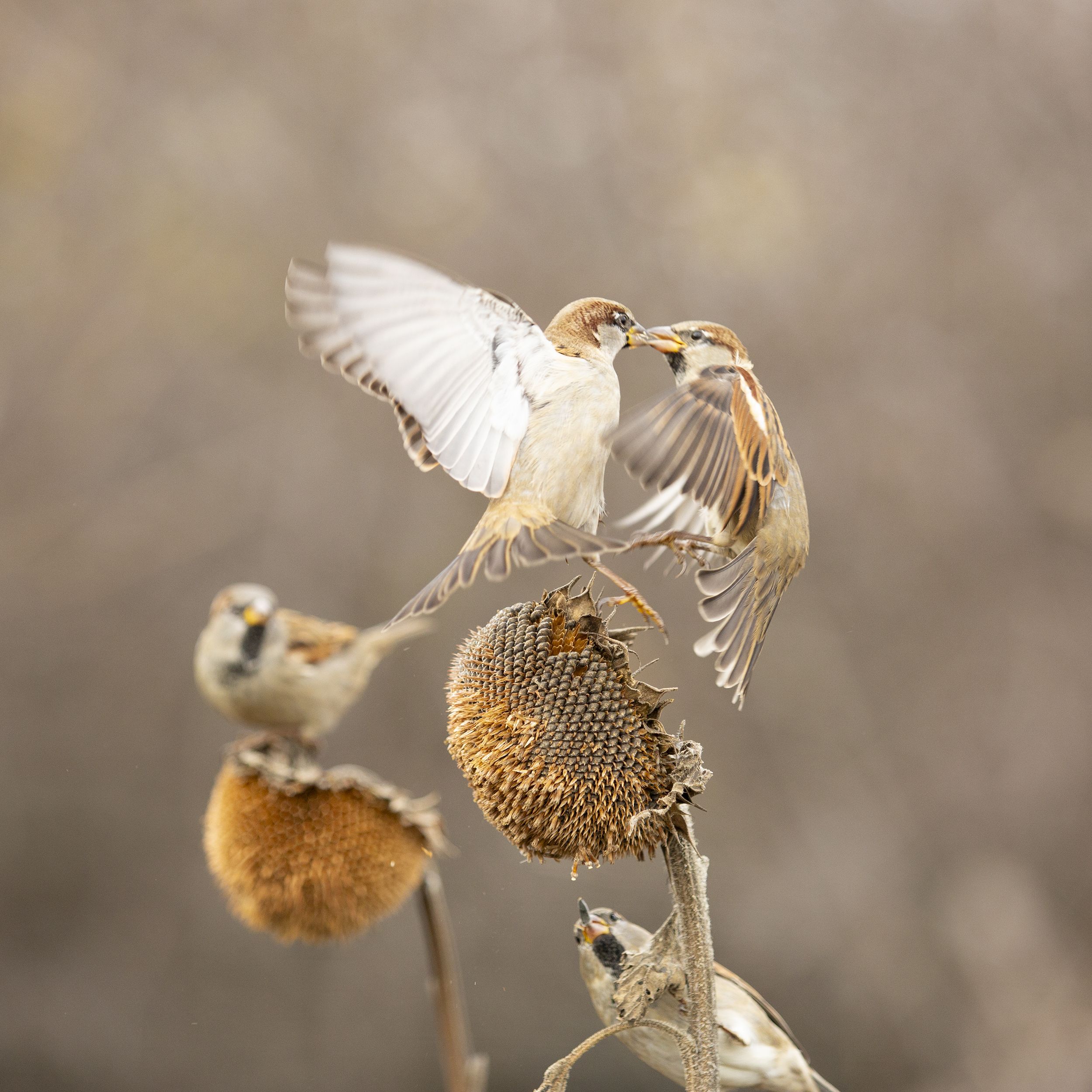 Фотография передаёт динамику и естественное поведение птиц — момент соприкосновения клювов в полёте над подсолнухом выглядит очень живо и точно. Хорошо проработаны детали оперения и текстура семян.
