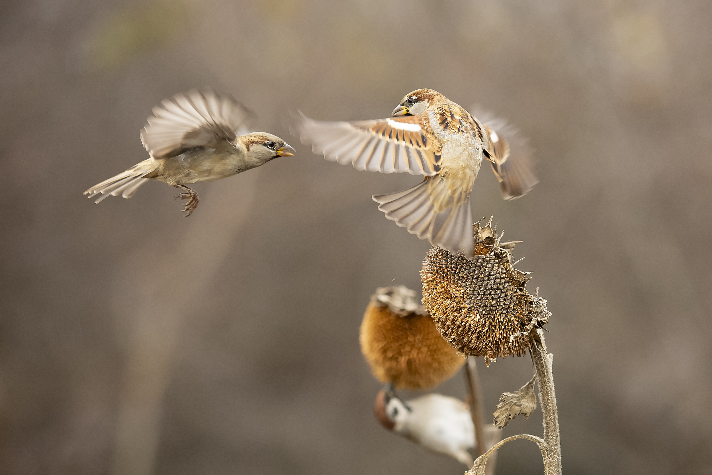 Валерий, у Вас получилось кадр с живым движением — птицы в полёте, как будто застыли в моменте, а сухой подсолнух добавляет сюжета. Просто, но с хваткой.
