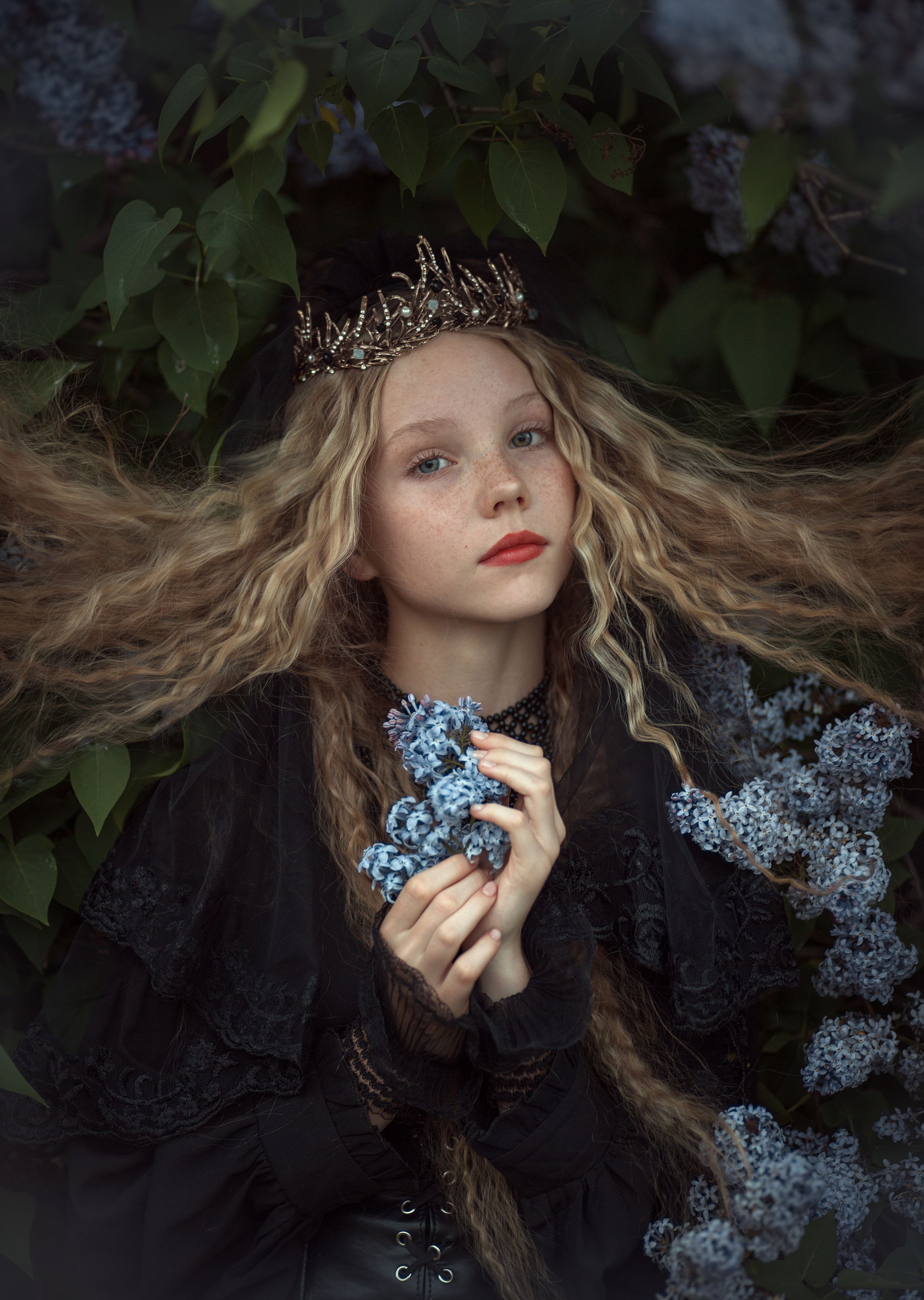 На фотографии запечатлен атмосферный портрет молодой женщины с длинными светлыми волосами, развевающимися на ветру. Она одета в элегантное черное платье и украшена изящной короной, что придает образу сказочное звучание. В руках девушка держит небольшой букет голубых цветов, создавая контраст с темным фоном из зелени. Работа фотографа Тамары Чопоровой передает настроение таинственности и красоты, превращая обычный садовый пейзаж в волшебную декорацию для этого выразительного снимка.