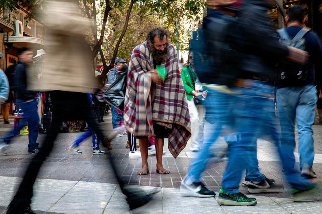 En la fotografía, Luis Mauricio Rojas Acevedo, quien lleva más de veinte años viviendo en las calles debido a su adicción al alcoholismo y a la pasta base, droga hecha en base a sulfato de cocaína que contiene sustancias tóxicas para el organismo, como parafina, plomo y ácido sulfúrico. Para sobrevivir, pide dinero, descalzo y acompañado solo de una frazada en el Centro de Santiago.