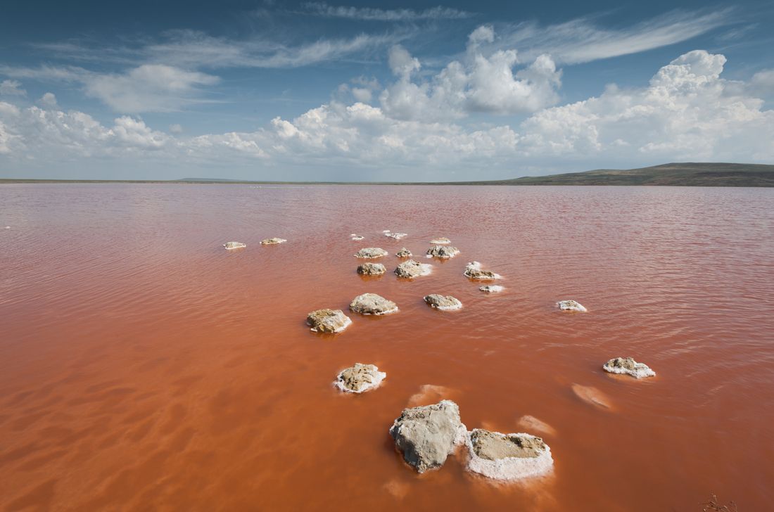 живет микроорганизмы типа какой то водоросли очень мелкой которая в момент цветения выделяет бетокаротин и отчего вода и окрашивается так. Вот по этому чудо природы Крыма много моих постов http://maks-kutashev.livejournal.com/tag/%D0%BA%D0%BE%D1%8F%D1%88%D1%81%D0%BA%D0%BE%D0%B5%20%D0%BE%D0%B7%D0%B5%D1%80%D0%BE