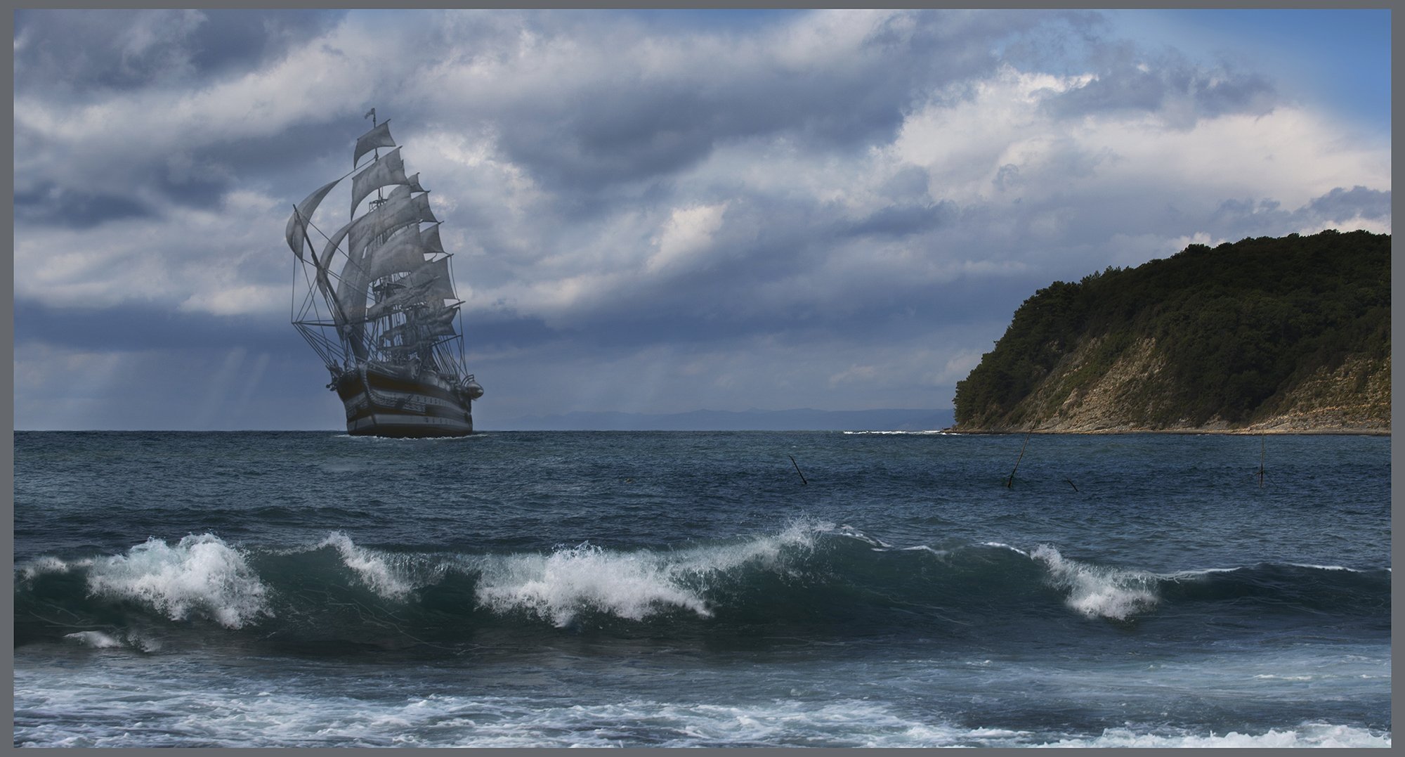 Имхо красиво, но чувствуется неестественность в паруснике. Не совсем понятно почему: то ли потому, что при таком крене буруны по левому борту должны быть больше чем по правому, то ли не согласуется освещенность, то ли парусник от фотографа визуально находится на таком же удалении, как и правый берег, который выглядит резко, а борт парусника не резок.