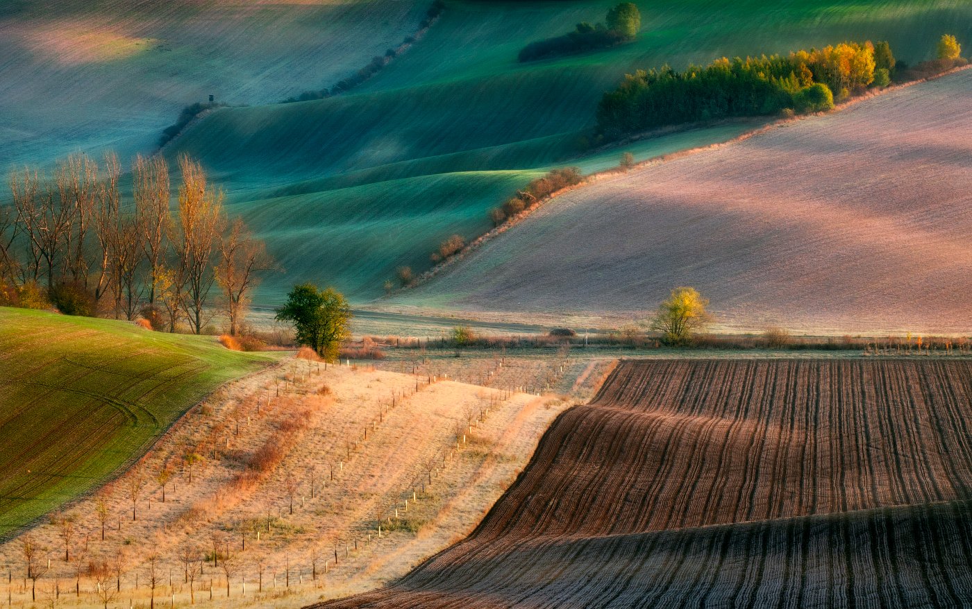 Моравия, волны, поля, утро, деревья, осень, рассвет, Cтанислав Малых