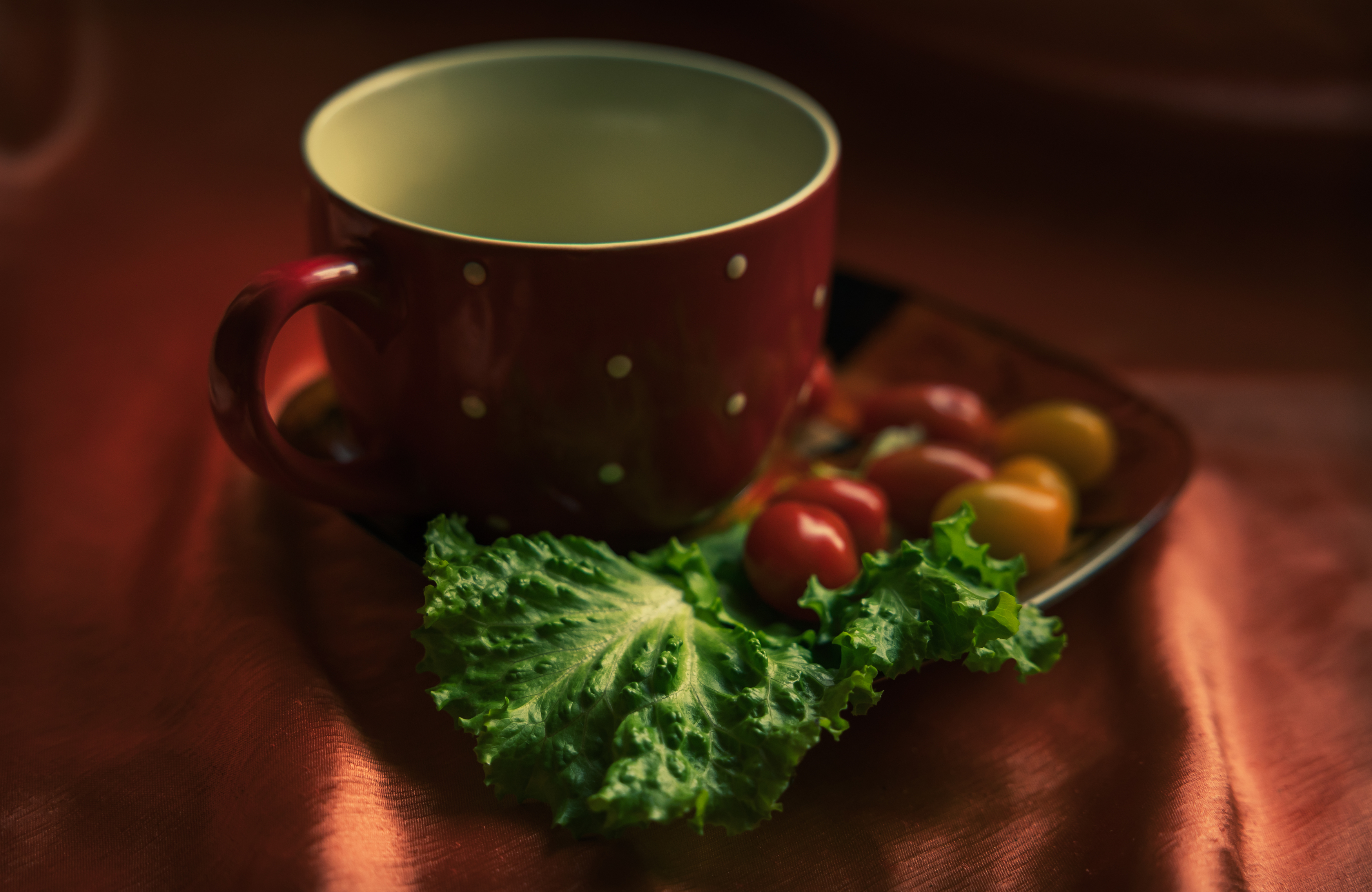 Dārzeņu palete siltajās krāsās kombinācijā ar krūzi.