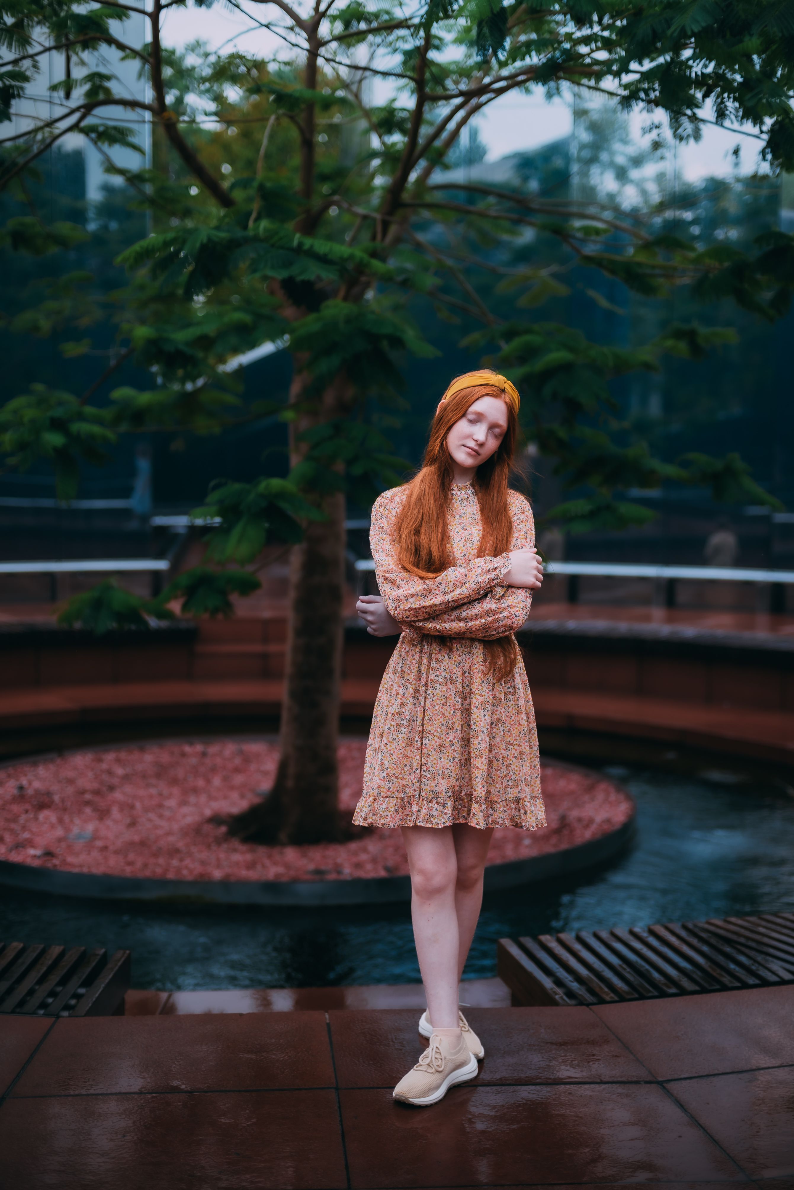 Хорошо обыграна цветовая гамма — тёплые оттенки платья и повязки на голове мягко контрастируют с прохладной зеленью и серым фоном. Композиция устойчива: фигура в центре, дерево как естественный акцент, вода и плитка — текстура, которая не перегружает.