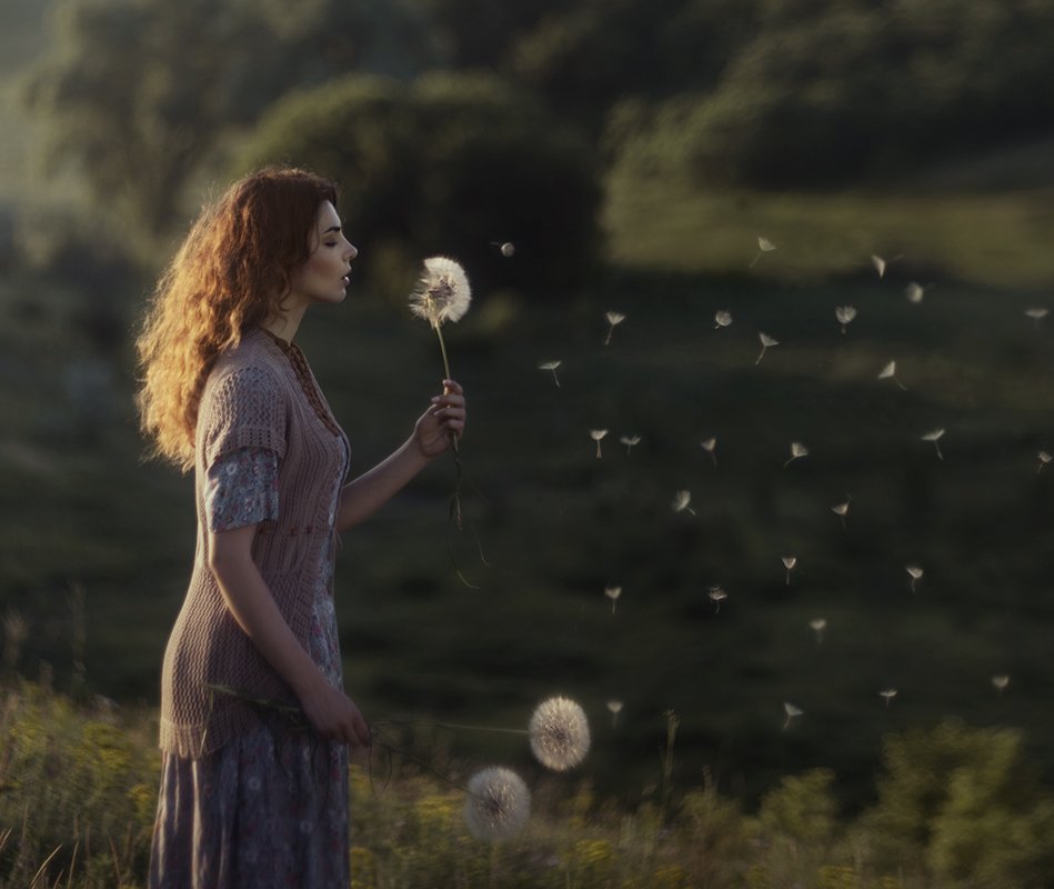 В тёплом свете заката девушка стоит на холме, держа в руке одуванчик. Ветер разносит его лёгкие семена, создавая в воздухе тонкую дымку. Кадр передаёт ощущение умиротворения и связи с природой. Зелёные склоны и мягкий свет придают сцене поэтическую атмосферу. Фотография Давида Д.