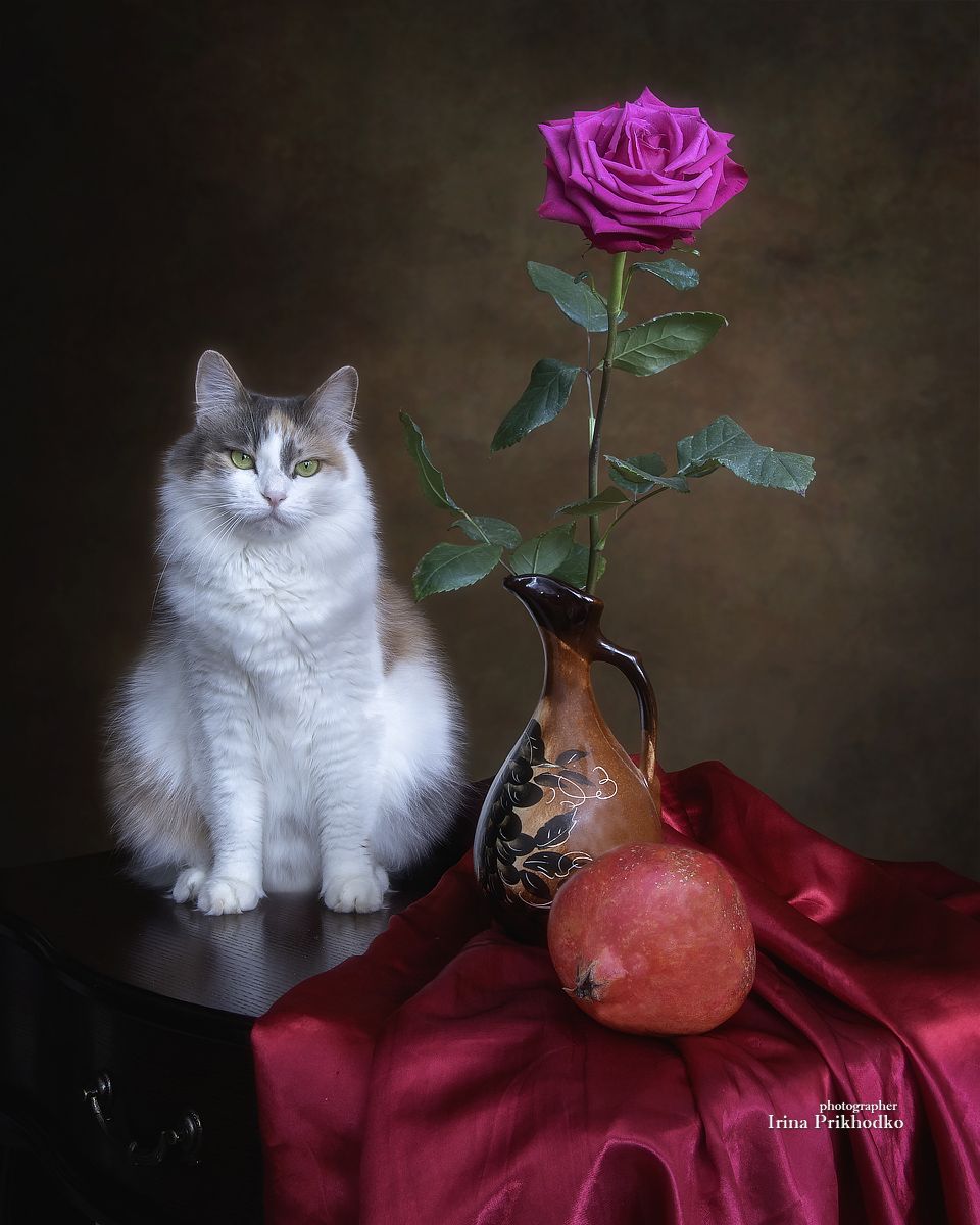 домашние животные, кошка, портрет, цветы, роза, гранат, Приходько Ирина