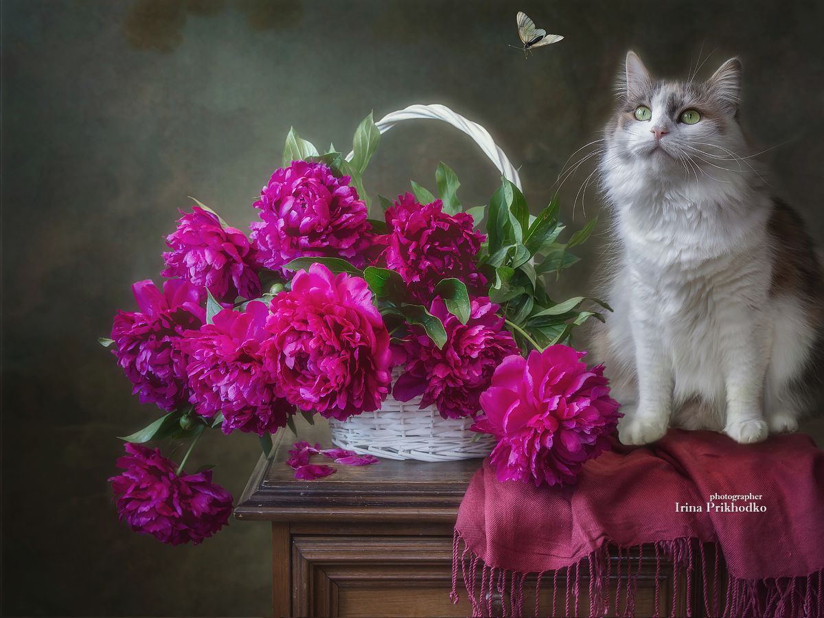 натюрморт, цветы, пионы, кошки, домашние животные, Приходько Ирина