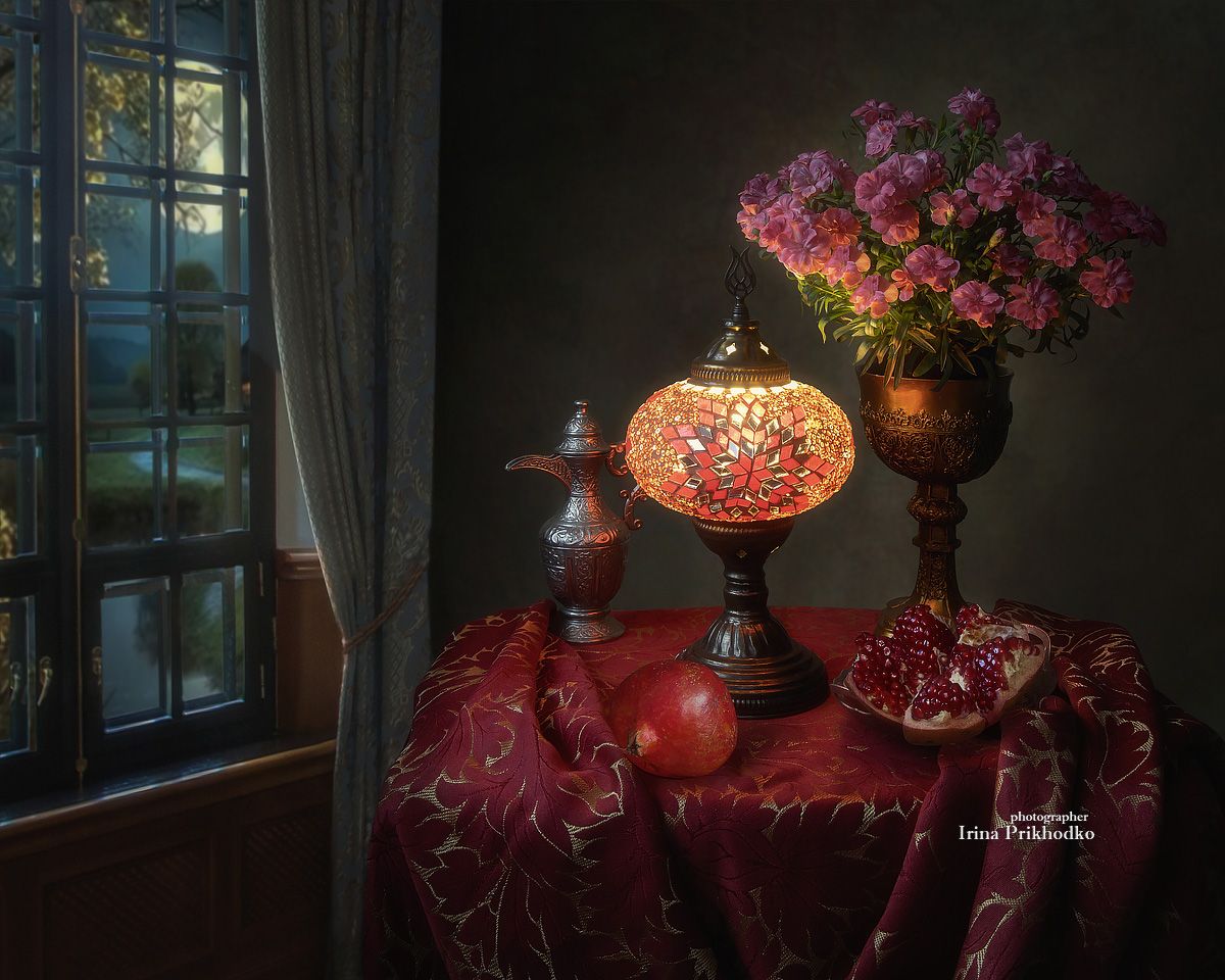 натюрморт, гранат, горящая лампа, вечер, интерьер, цветы, букеты, Приходько Ирина