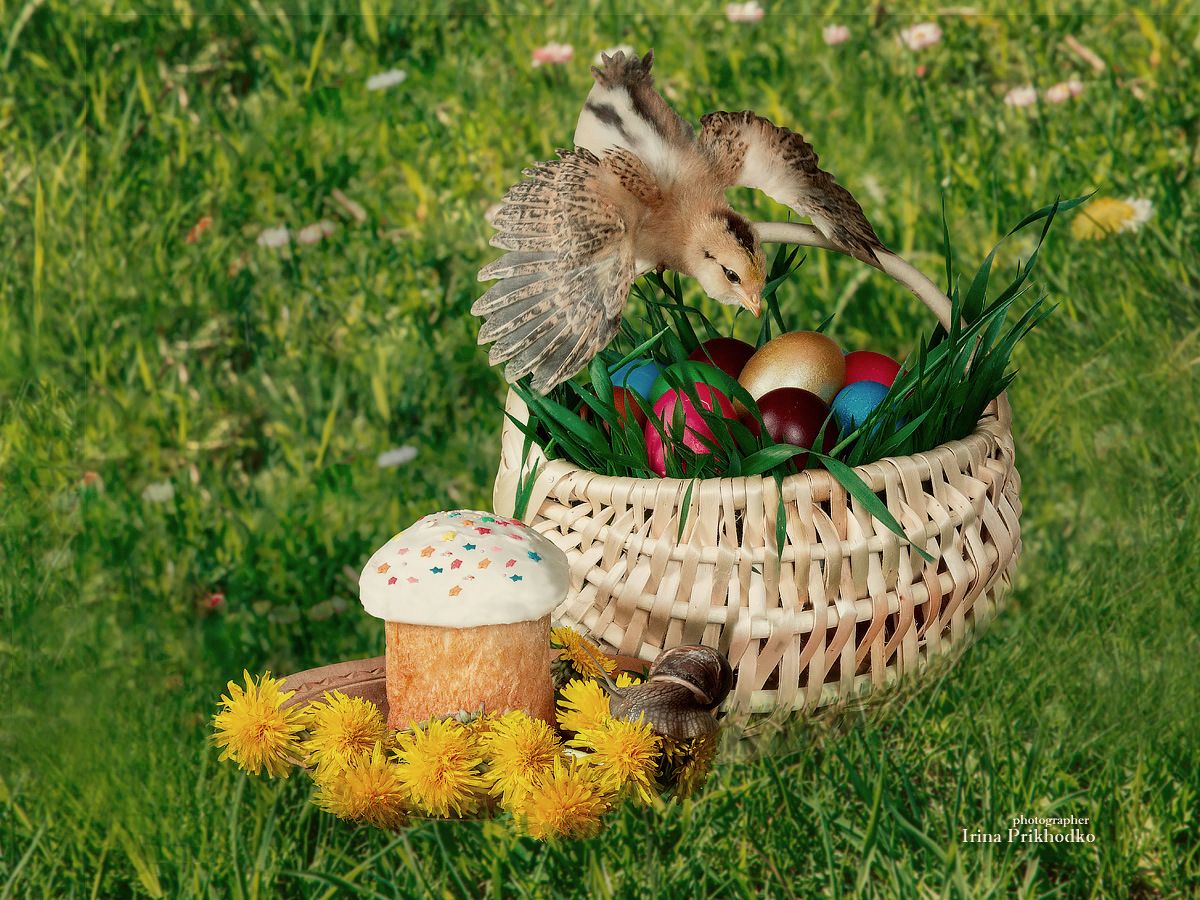 натюрморт, Пасха, Поздравительная открытка, лужайка, пасхальные яйца, цыпленок, Приходько Ирина
