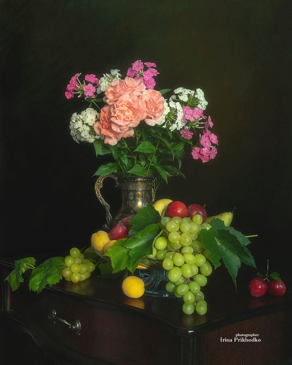 натюрморт, цветы, фрукты, темный фон, Приходько Ирина