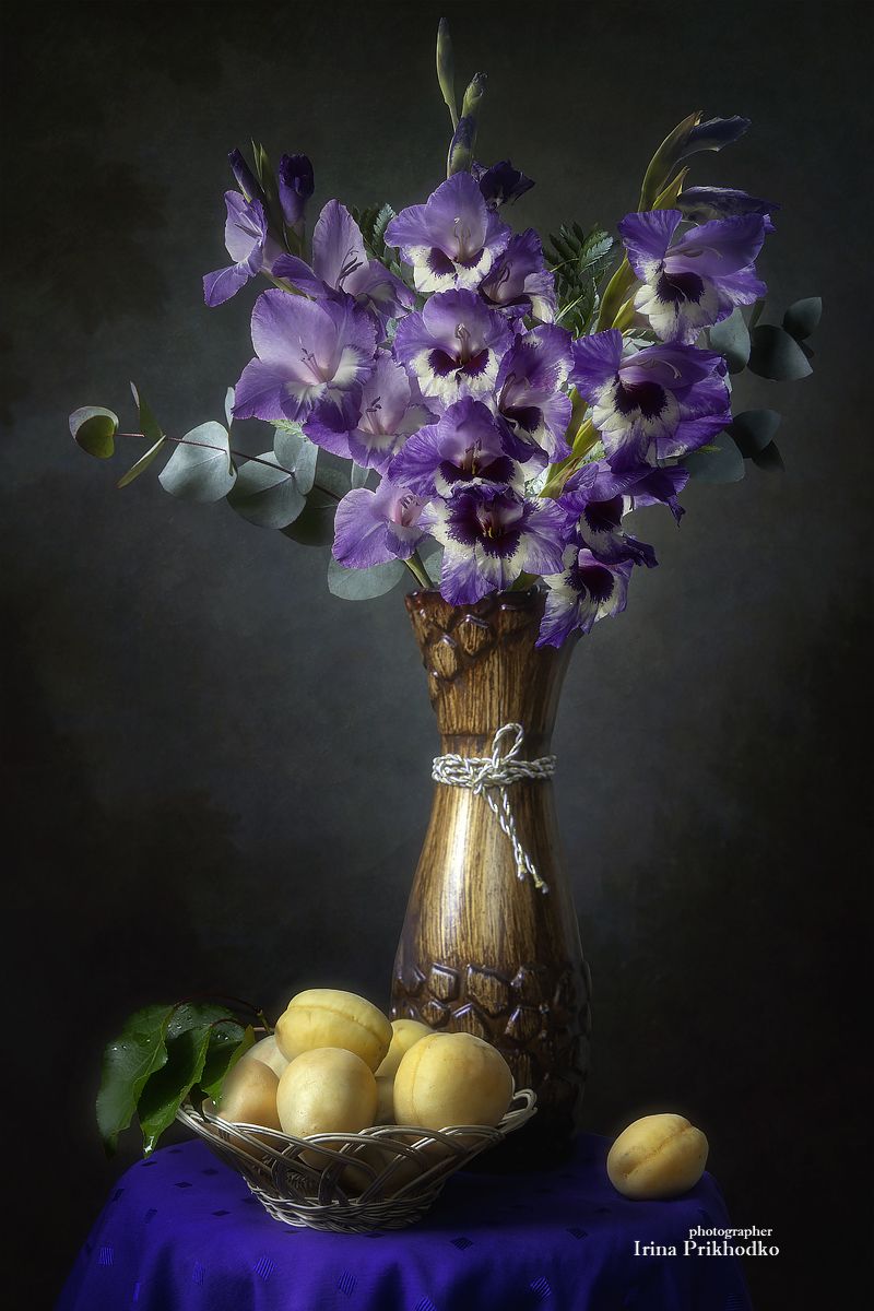 натюрморт, цветы, гладиолусы, фрукты, абрикосы, лето, букет, Приходько Ирина
