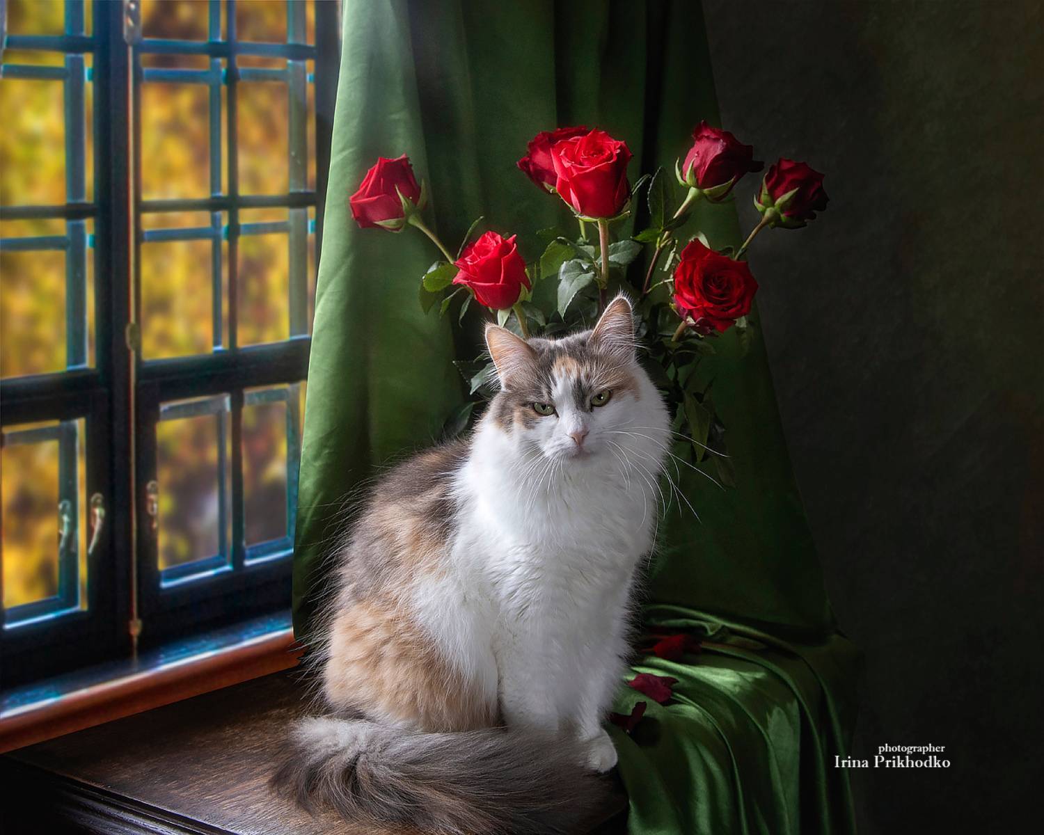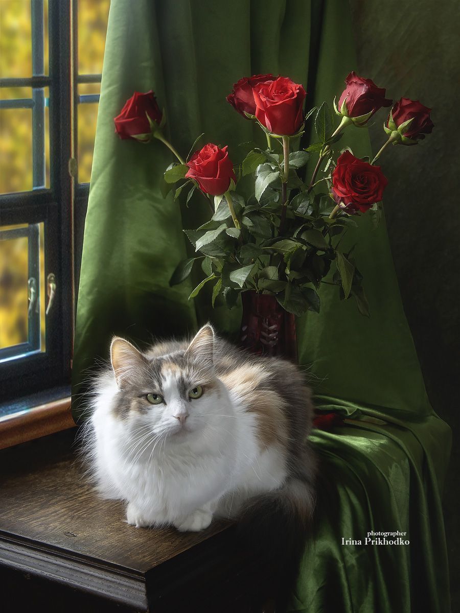 домашние животныепитомцыкошкимодельпортретцветыбукет. розы
