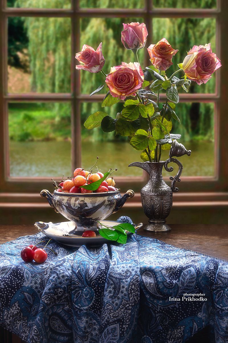 натюрморт, цветы, букеты, фрукты, черешня, розы, Приходько Ирина