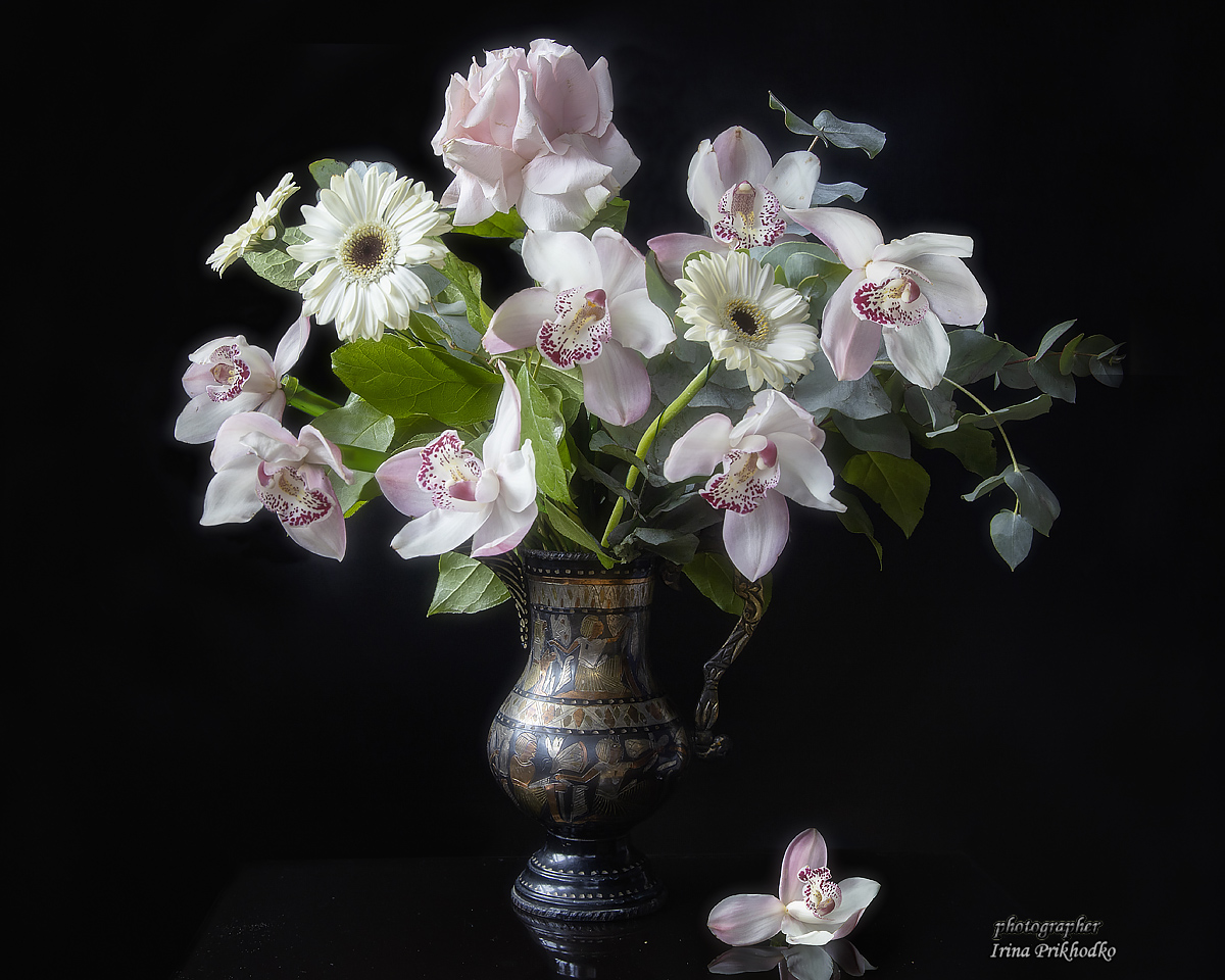 натюрморт, черный фон, букет, цветы, орхидеи, Приходько Ирина