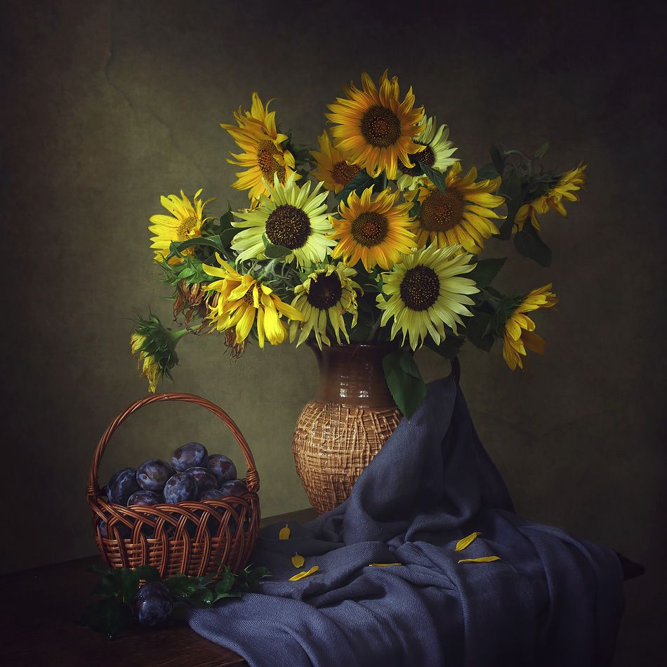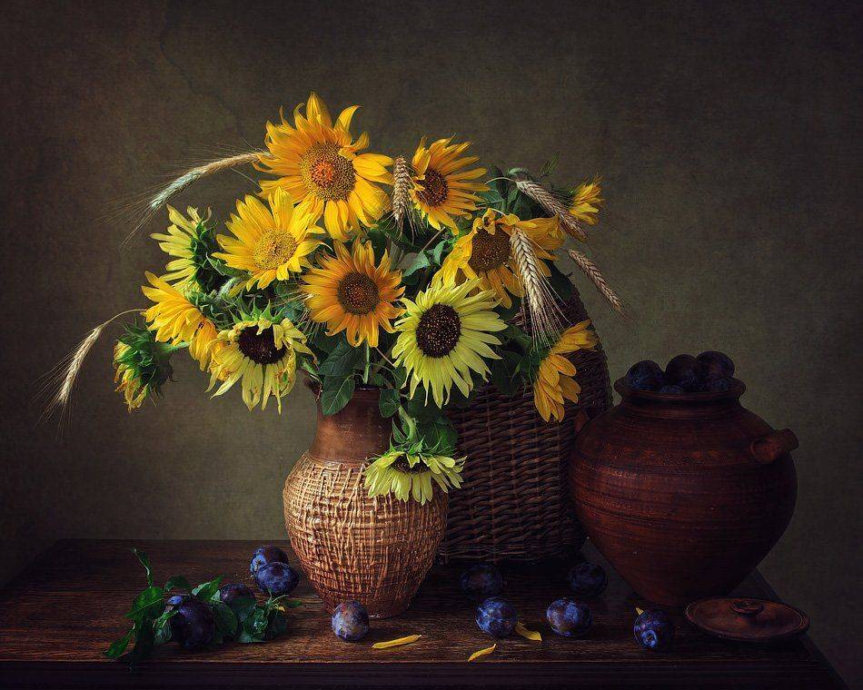 натюрмортсливыподсолнухикувшингоршок. корзинка
