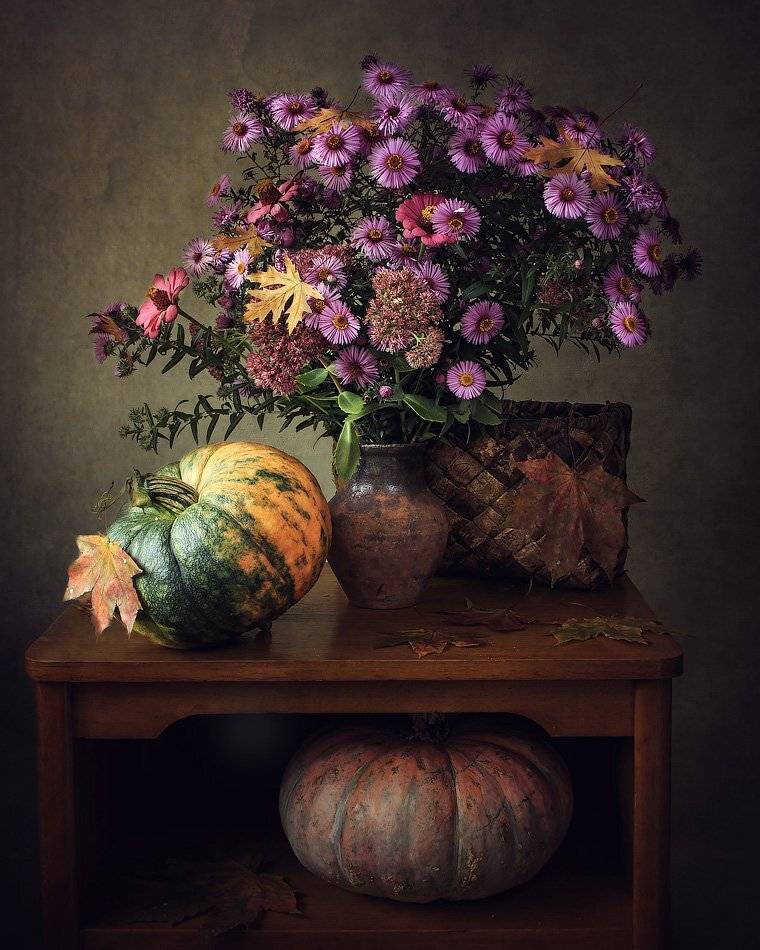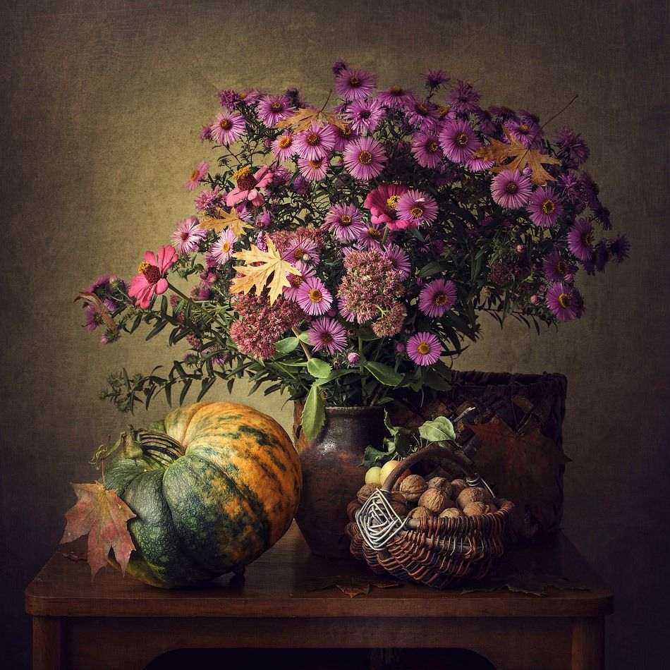 натюрмортосенний букеттыквыосенние листьякорзинакувшин