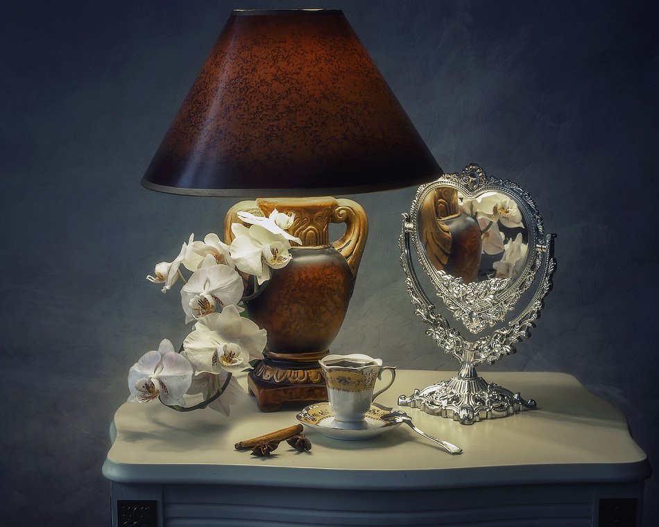 натюрморт, чашка кофе, орхидея, настольная лампа, зеркало, специи, Ирина Приходько