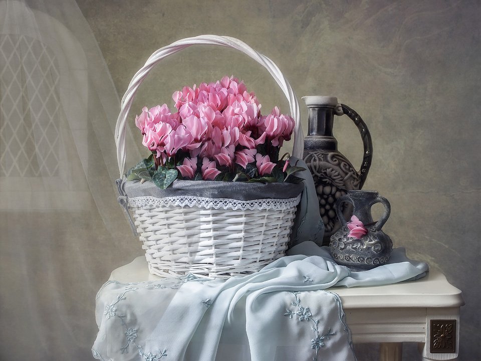 натюрморт, цикламены, корзина, кувшины, Ирина Приходько